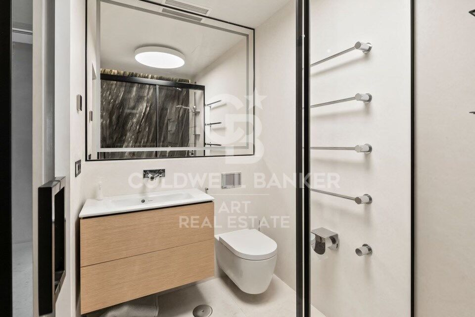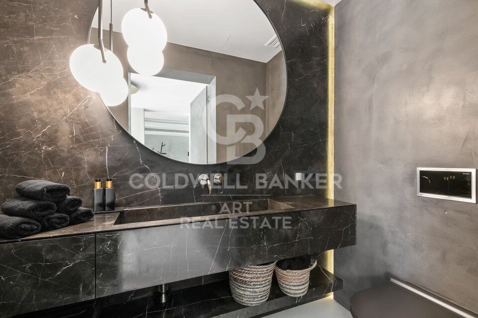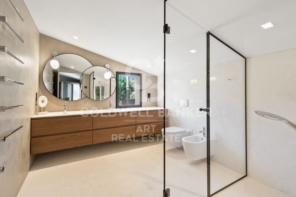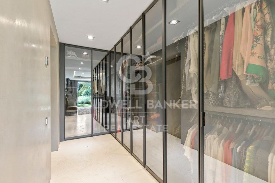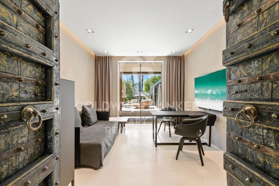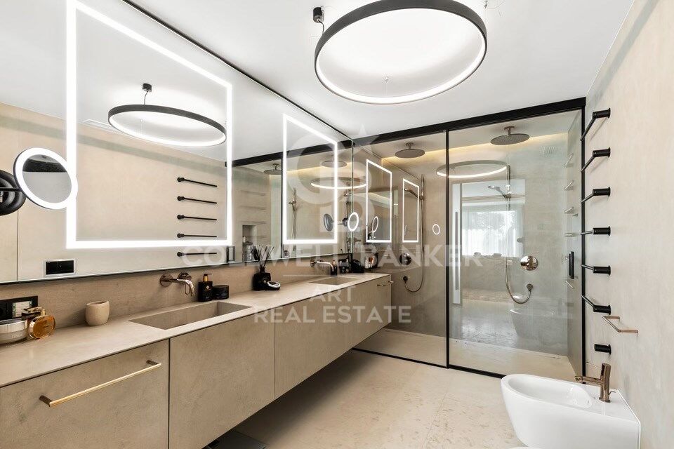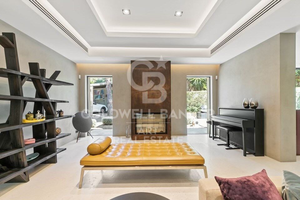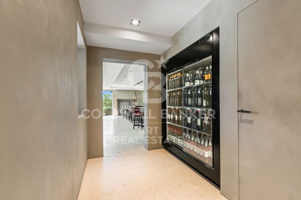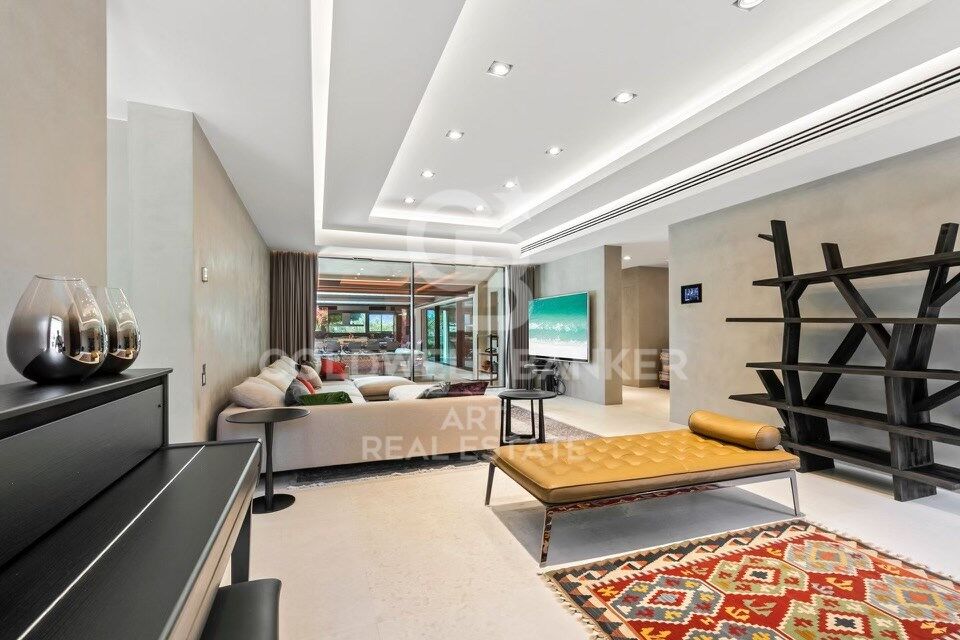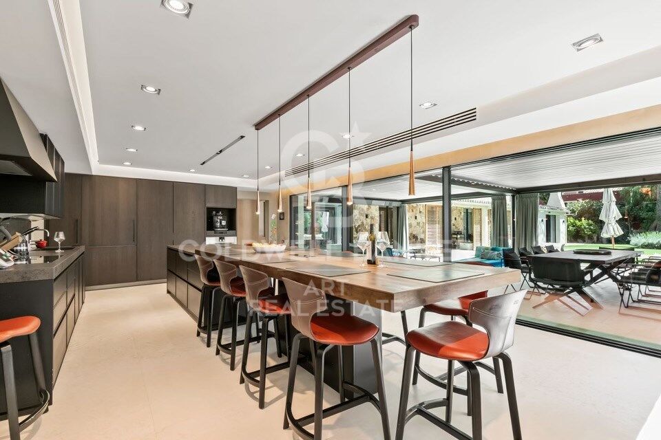À l'intérieur, les espaces de vie sont spacieux et élégants. Le salon et la salle à manger s'ouvrent sur une cuisine de designer équipée d'appareils électroménagers Gaggenau haut de gamme et de caves à vin. Une longue table centrale pouvant accueillir dix personnes, accompagnée d'une imposante cheminée, crée une atmosphère conviviale et raffinée.