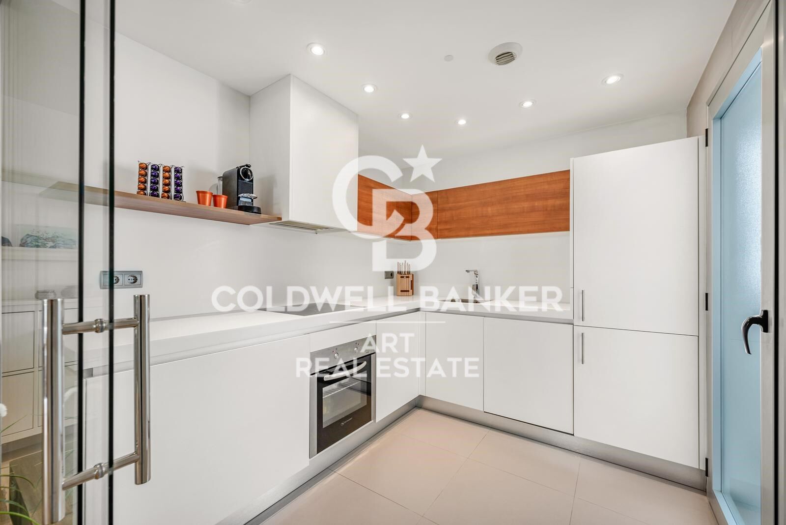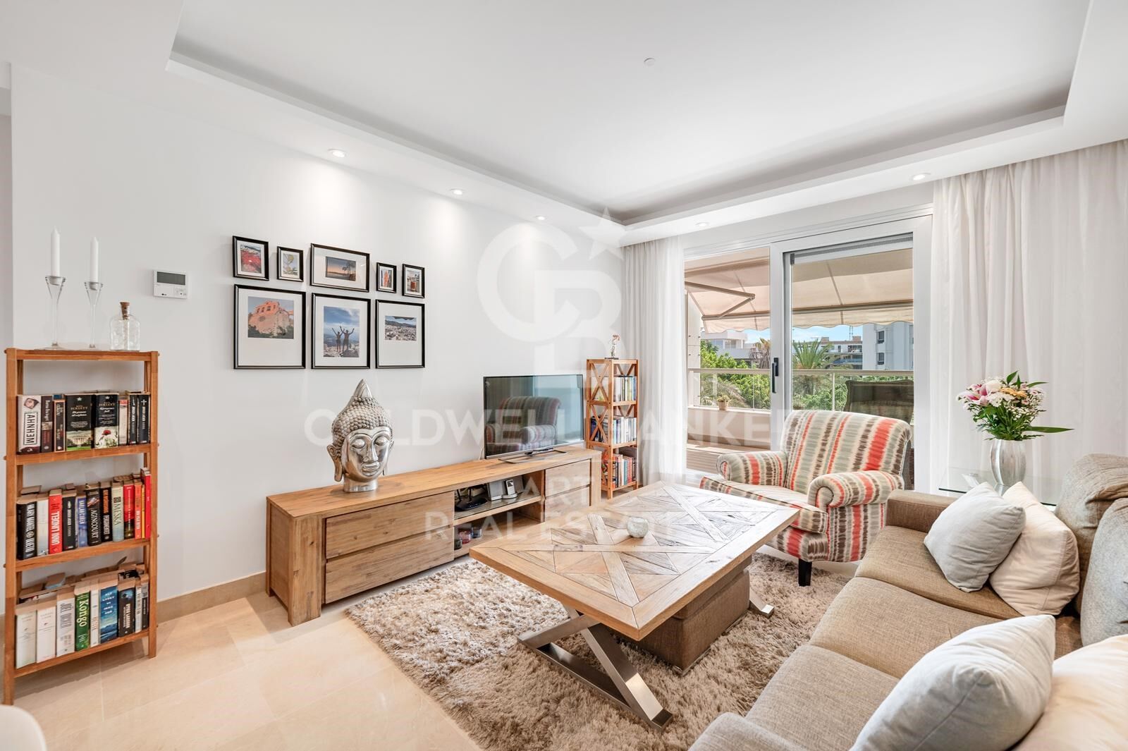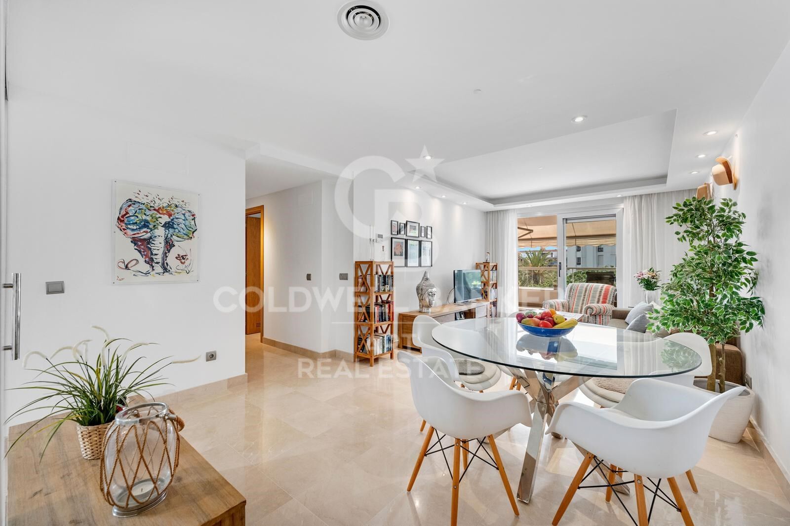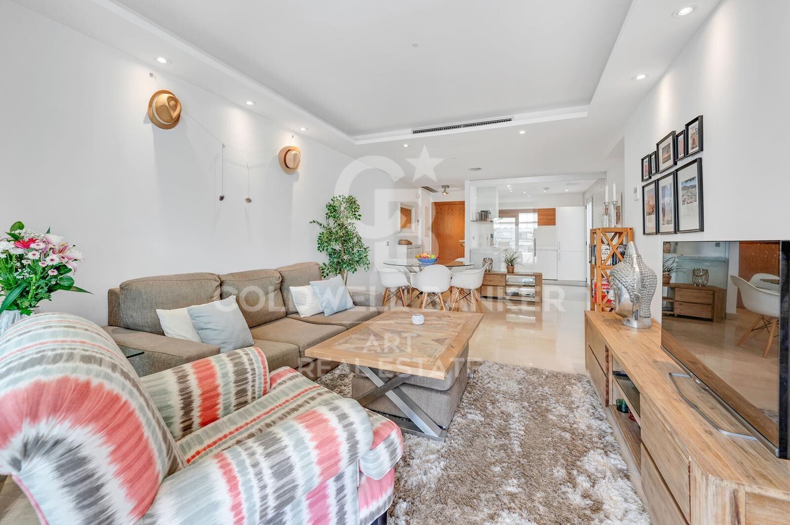 Le salon et la salle à manger sont lumineux et accueillants, avec accès à des terrasses privées qui prolongent naturellement l'espace de vie vers l'extérieur.