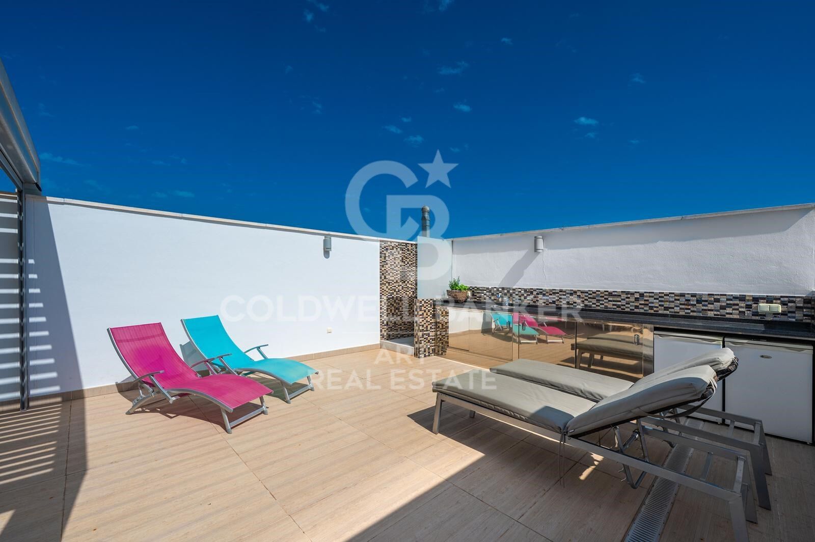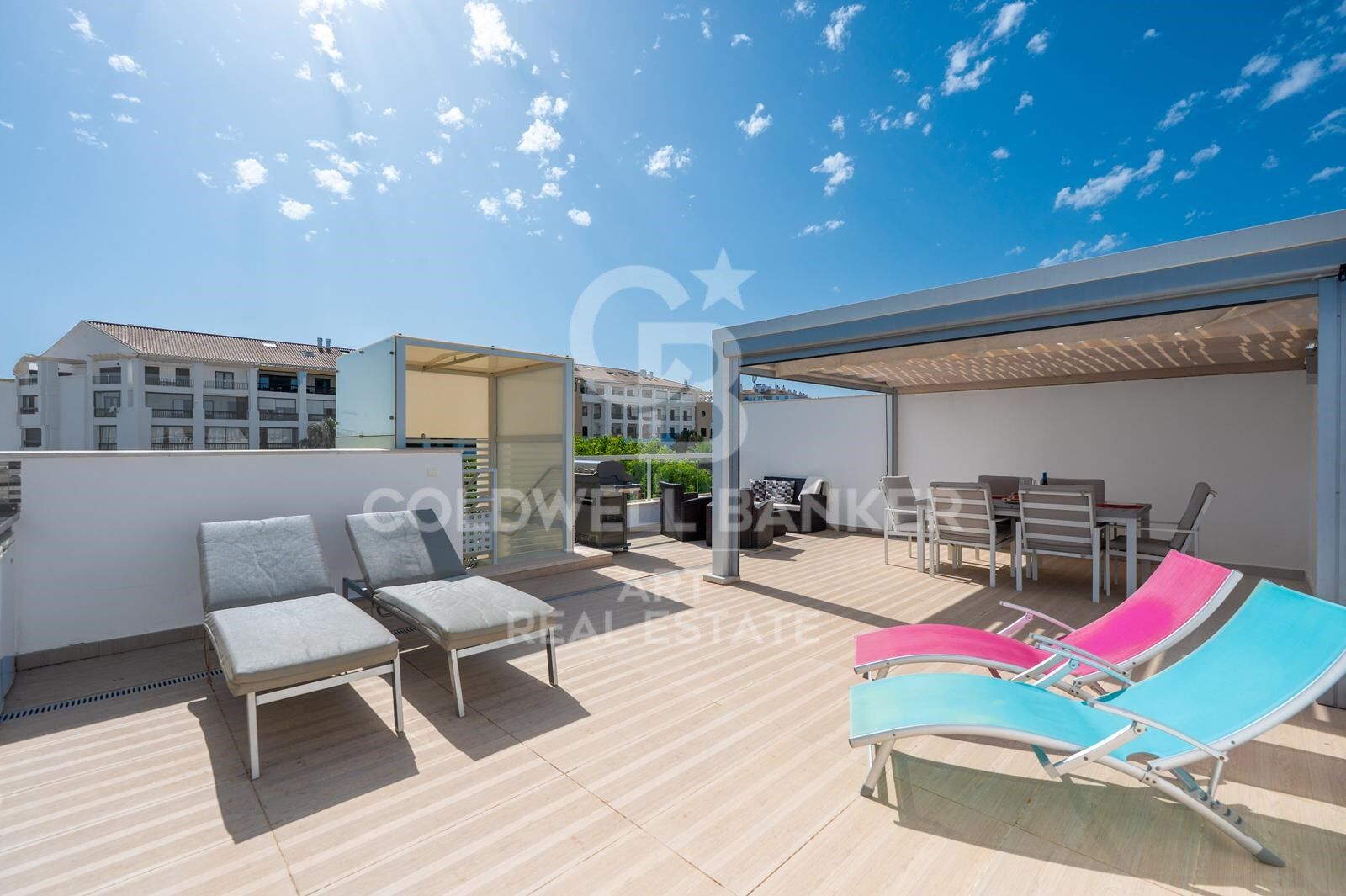 L'atout majeur de ce penthouse est son grand solarium privé sur le toit, entièrement équipé avec cuisine extérieure, coin repas et doucheidéal pour des repas en plein air, prendre le soleil ou recevoir amis et famille sous le ciel méditerranéen.