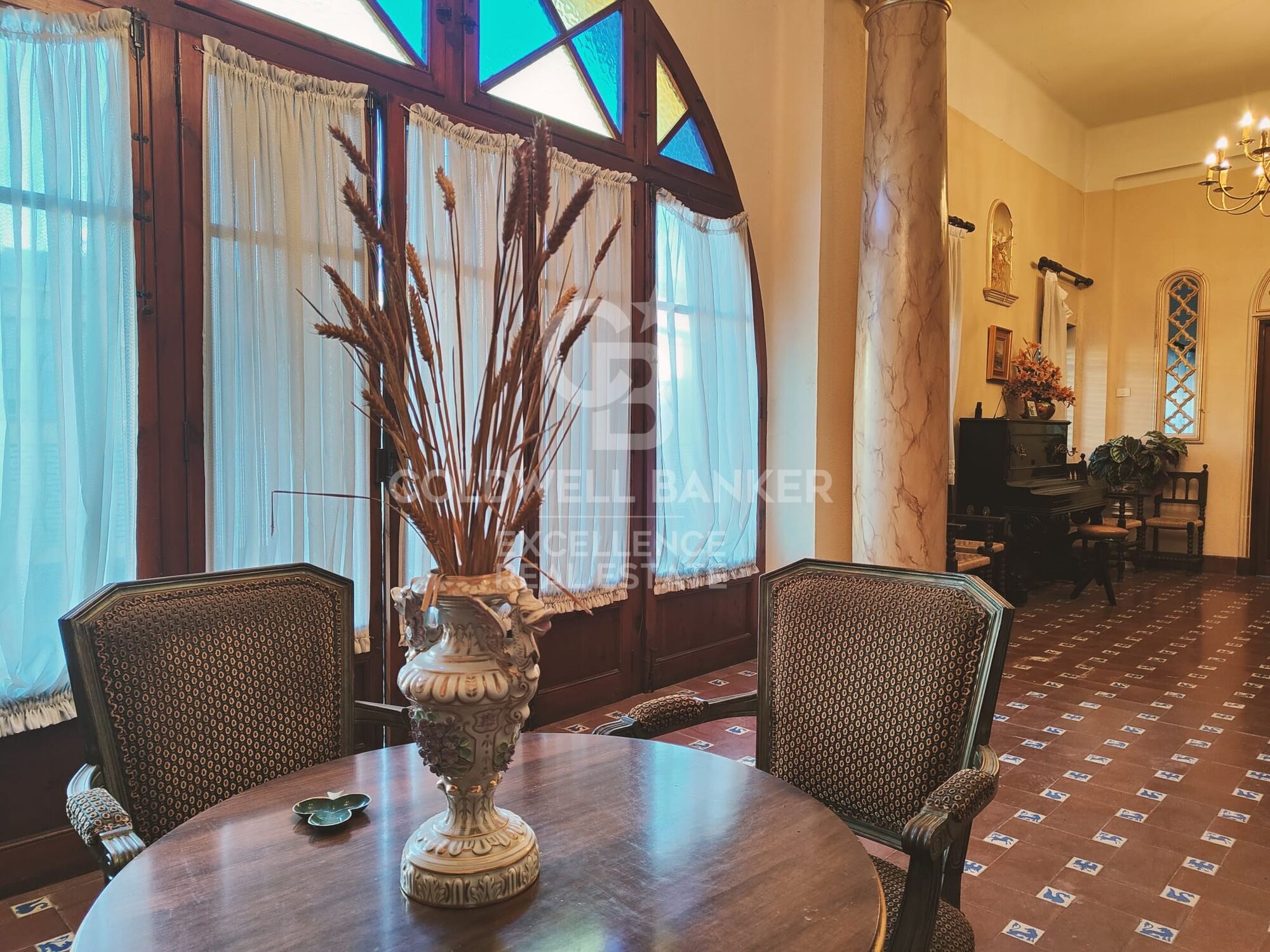 Rez-de-chaussée : spectaculaire hall de style majestueux avec des piliers en marbre, distribué dans un grand salon, une grande cuisine, un garde-manger, une salle à manger fermée et un salon avec cheminée.