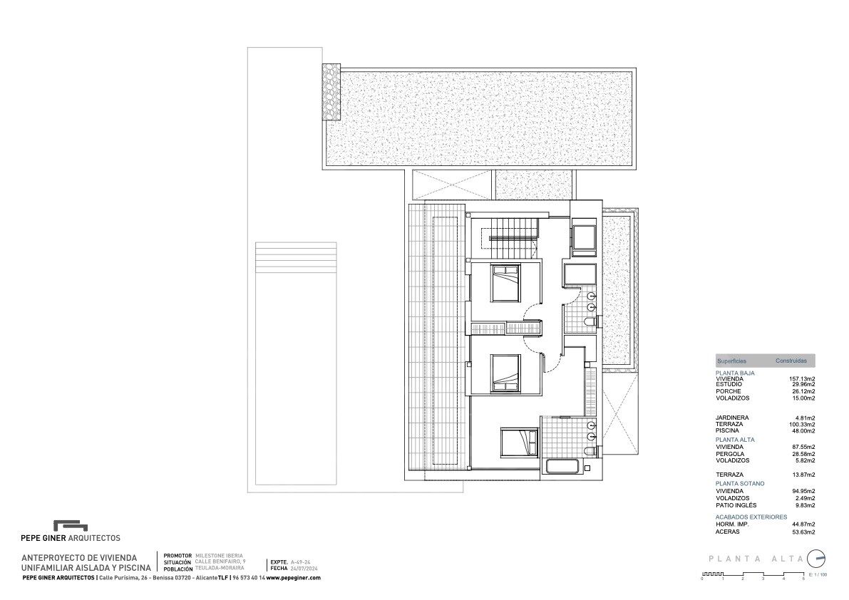Con una superficie construida total de 395,71 m², la vivienda ha sido cuidadosamente distribuida para ofrecer estancias amplias, luminosas y bien conectadas. En la planta baja se encuentran las zonas comunes, concebidas como espacios abiertos y versátiles que fomentan la convivencia y el bienestar. Aquí se sitúan el salón, el comedor, una cocina moderna y funcional con acceso directo al exterior, así como una habitación que puede utilizarse como dormitorio de invitados, despacho o sala de estar adicional, según las necesidades del propietario.