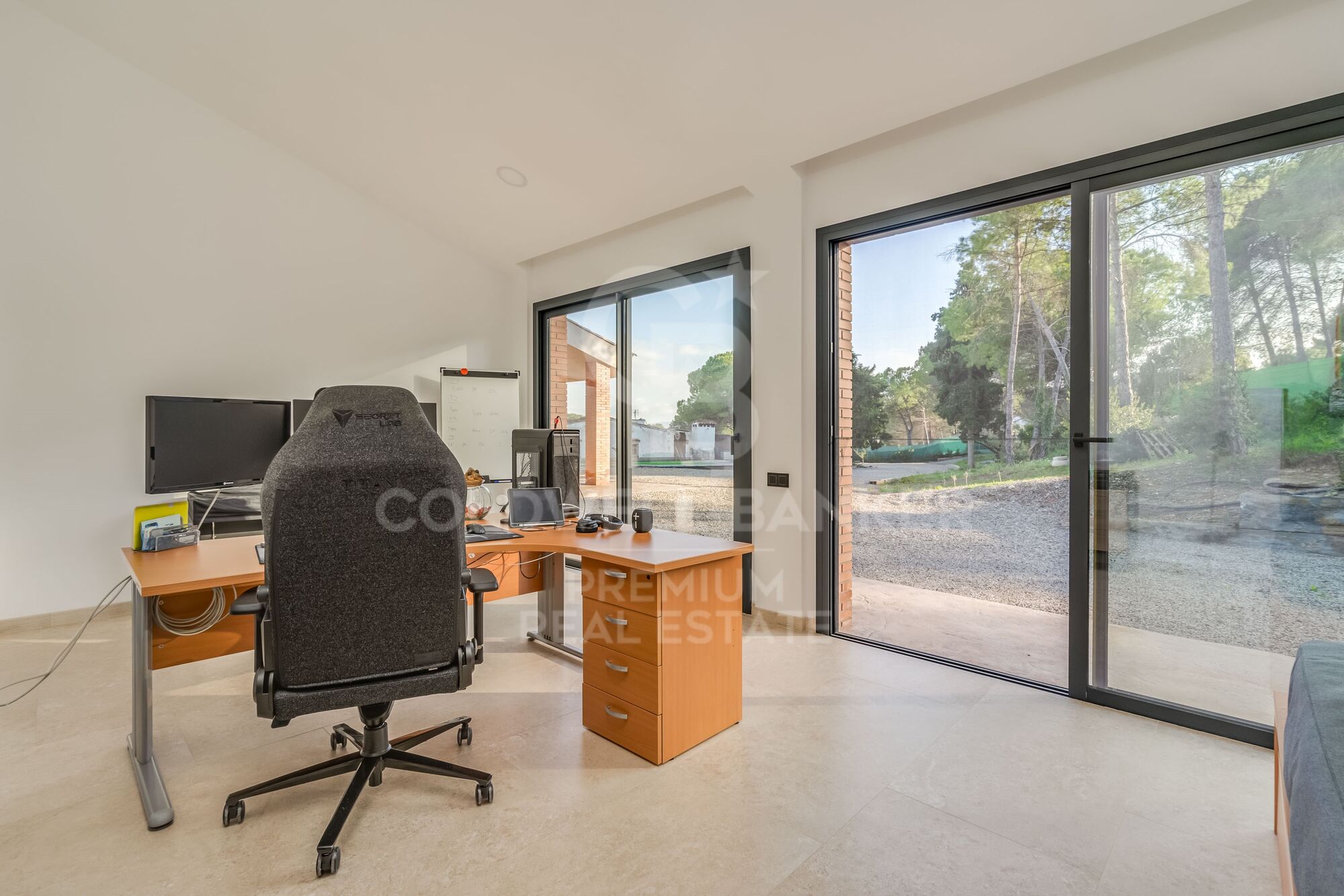La maison, répartie sur un étage, allie fonctionnalité et style dans chaque espace. Le cur de la maison est un salon-salle à manger spacieux et lumineux, où le design minimaliste et les vues panoramiques sur le jardin et la nature environnante deviennent les protagonistes. Cet espace est non seulement parfait pour se détendre, mais aussi pour recevoir les amis et la famille dans une atmosphère qui invite au plaisir. La cuisine, complètement ouverte et intégrée à l'espace, est un chef-d'uvre en soi. Avec des appareils électroménagers à la pointe de la technologie et des finitions dans des matériaux de haute qualité, il devient un lieu où cuisiner et partager se sentent comme un luxe quotidien.