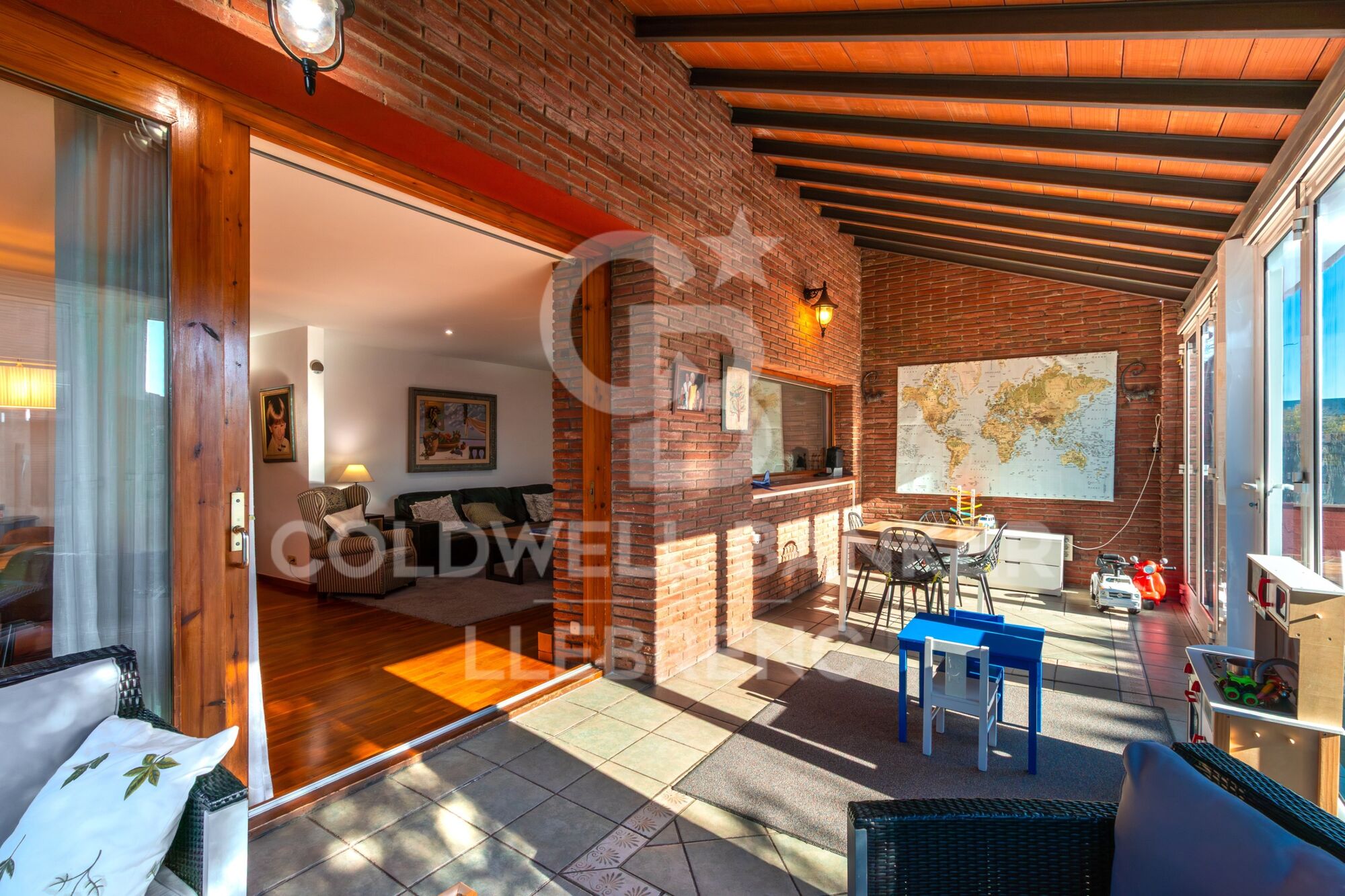 Un élégant salon-salle à manger de plus de 30 m², baigné de lumière naturelle grâce à un magnifique porche vitré orienté au sud, qui transforme cet espace en un lieu chaleureux et ensoleillé tout au long de la journée.