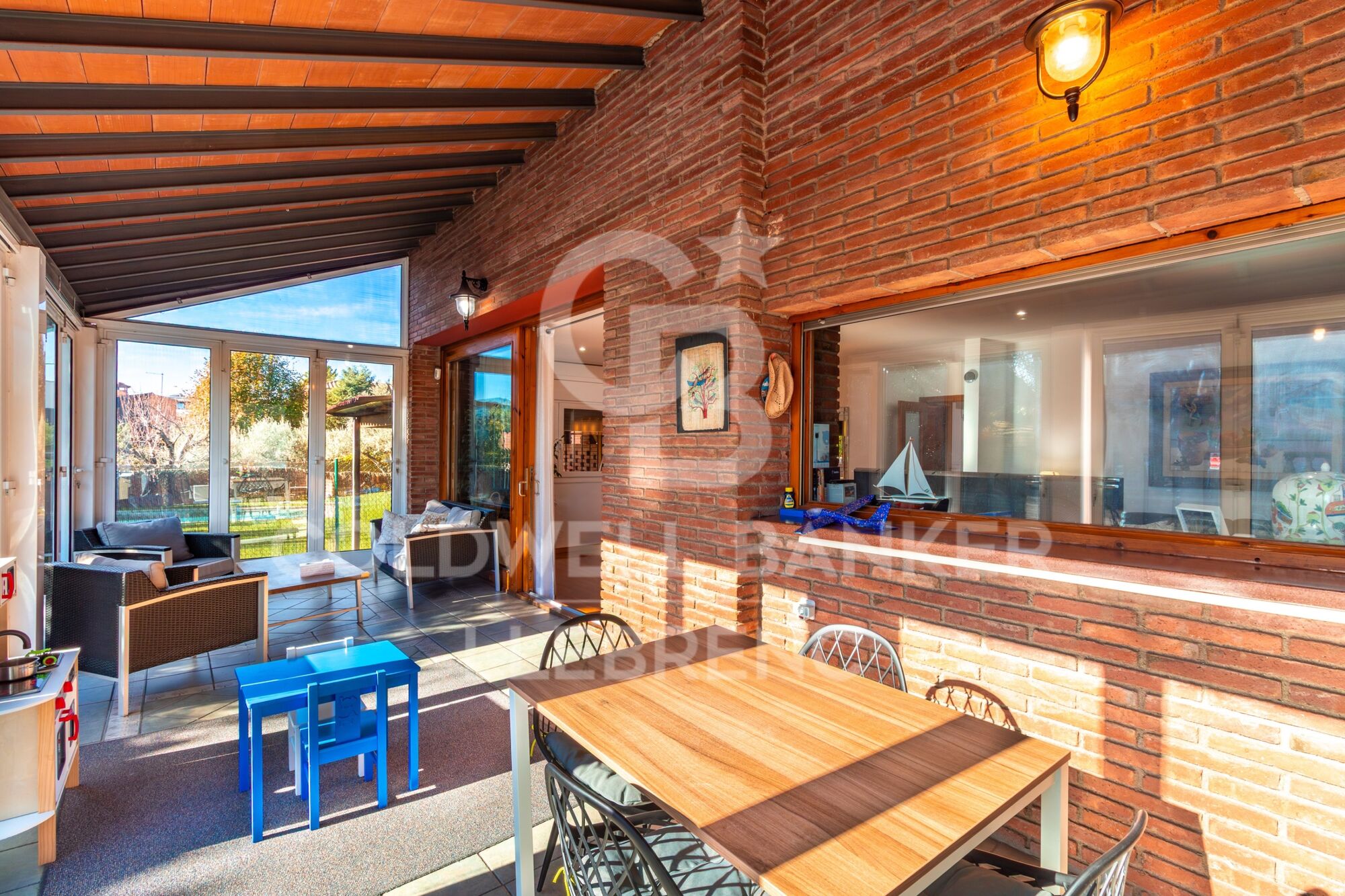 Un élégant salon-salle à manger de plus de 30 m², baigné de lumière naturelle grâce à un magnifique porche vitré orienté au sud, qui transforme cet espace en un lieu chaleureux et ensoleillé tout au long de la journée.