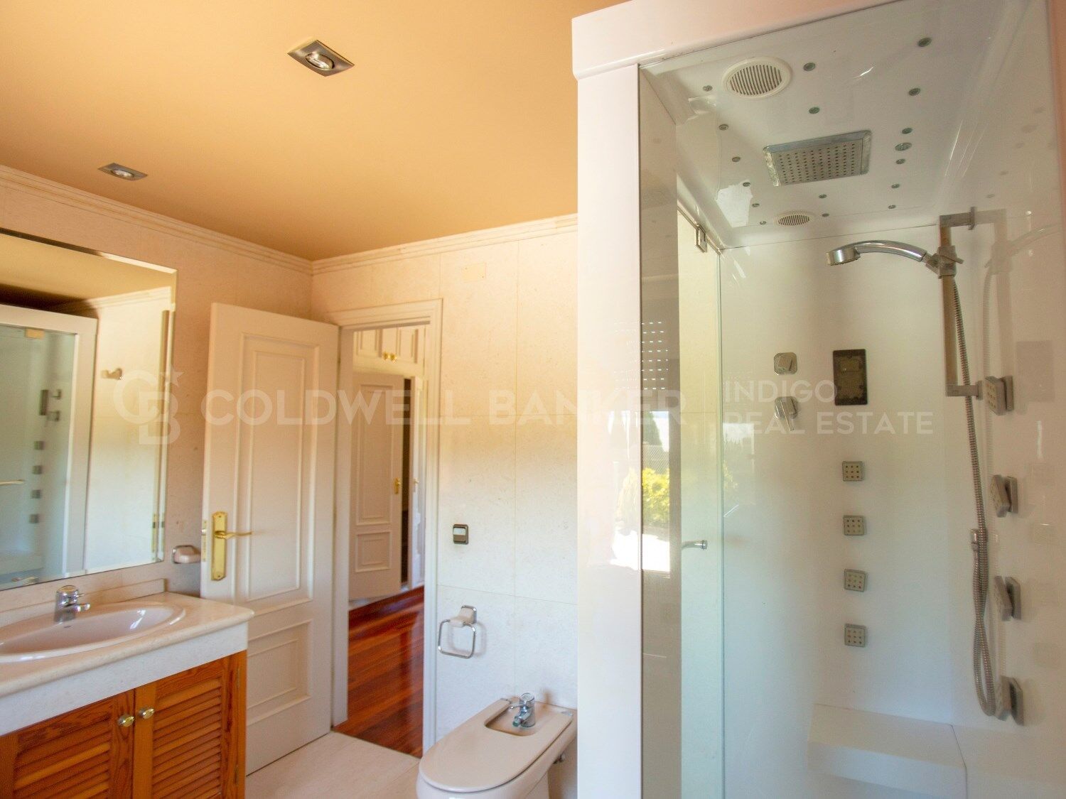 On the ground floor, you will find a large traditional kitchen, a spacious and bright living room that opens up as a perfect stage for family gatherings and intimate meetings. A garage and direct access to the heated pool with a retractable roof allow you to enjoy a revitalizing dip in any weather. This level also features a squash court and spacious changing rooms, where everything is designed on a grand scale to enjoy every moment shared with friends and loved ones.