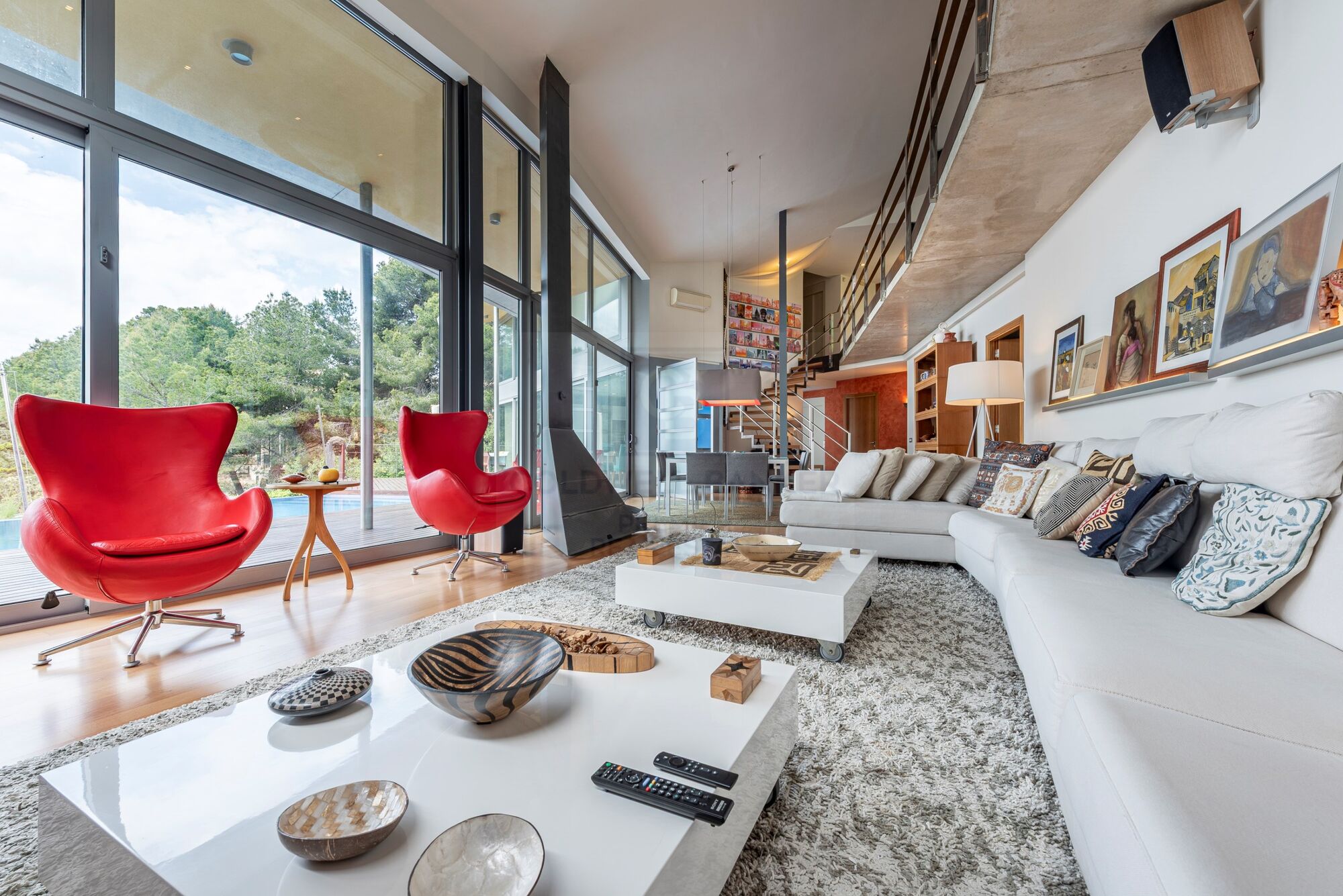 Au rez-de-chaussée, nous accédons par un élégant hall qui se connecte à un spacieux salon-salle à manger à double hauteur. Cette zone est divisée en deux niveaux : le supérieur abrite une bibliothèque confortable avec un bureau, et le inférieur, un salon magnifiquement décoré qui se confond avec la salle à manger. Grâce à ses fenêtres de grand format et à son design ouvert, la lumière naturelle est le protagoniste à tout moment.