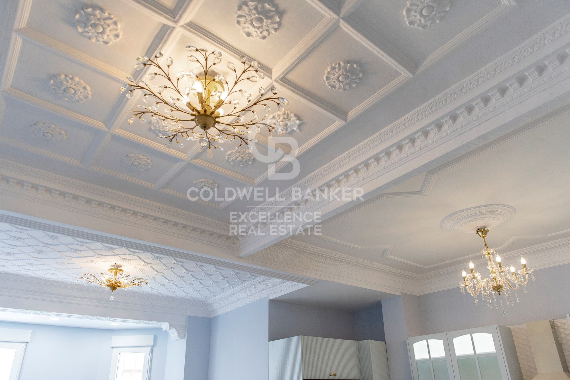 - Plafonds très hauts avec moulures d'origine restaurées qui ajoutent de l'élégance et de la personnalité.