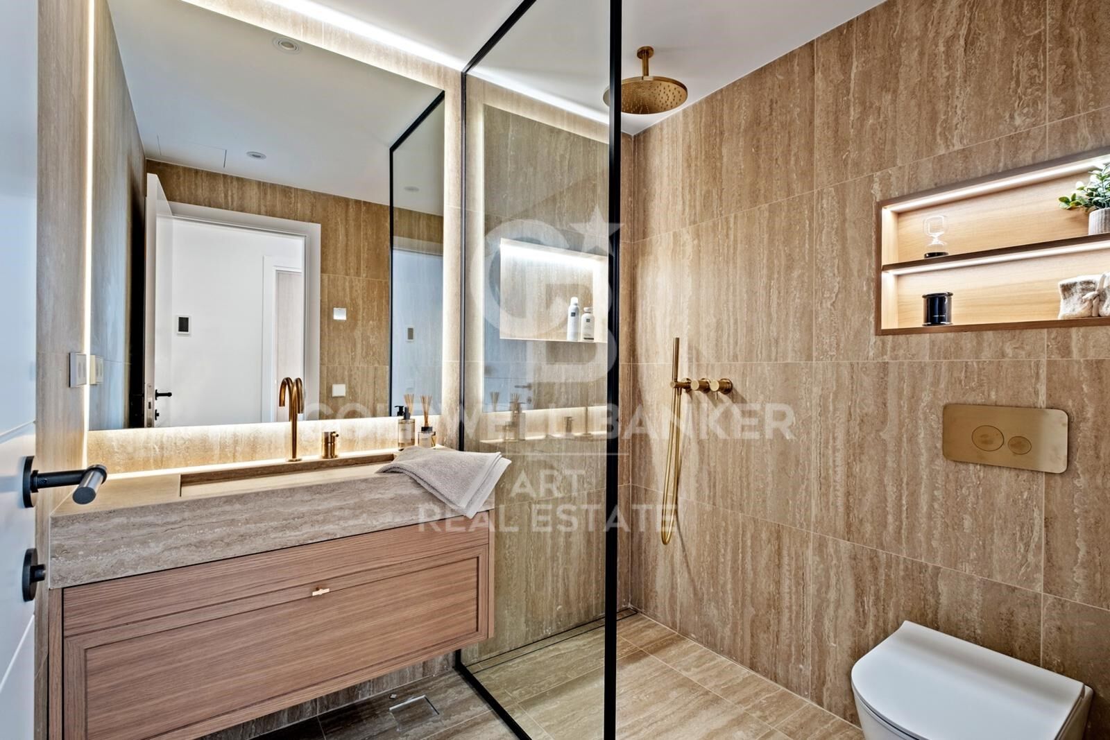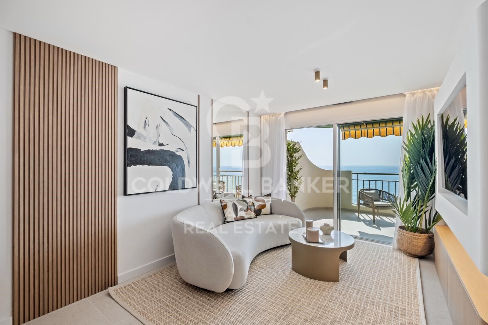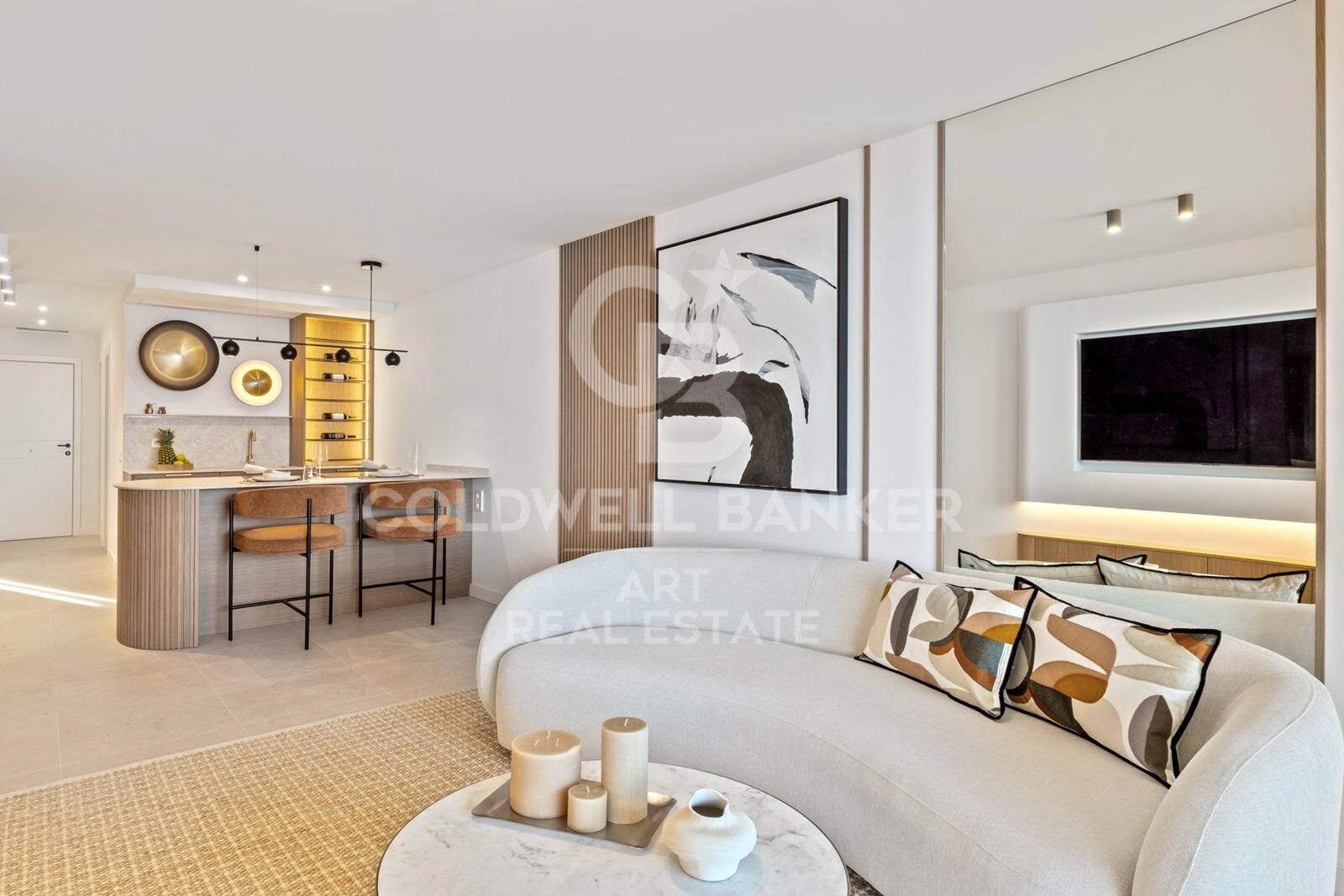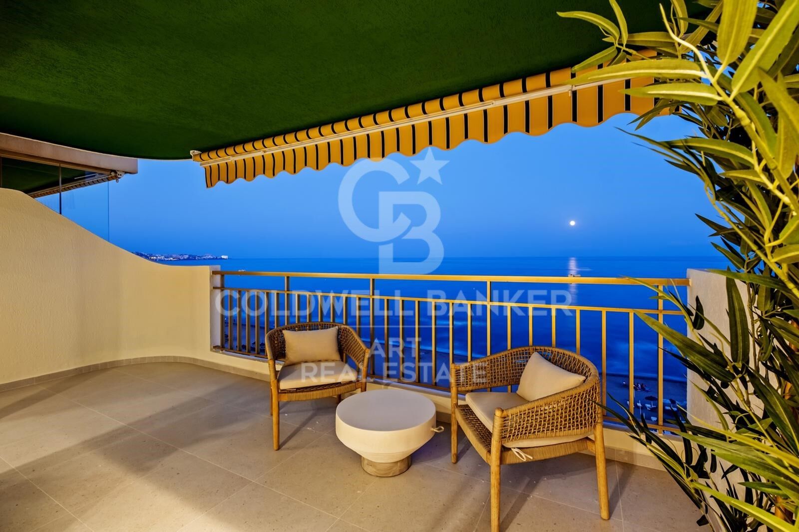 Las vistas panorámicas del Mediterráneo ocupan un lugar central en el momento en que entras, con vidrio del piso al techo que enmarca el horizonte infinito. El diseño de planta abierta conecta la sala de estar con una cocina diseñada a medida, con gabinetes de borde redondeado, iluminación LED indirecta y una elegante exhibición de vinos abierta, que combina texturas naturales con funcionalidad moderna. Ambos baños están elegantemente terminados con duchas de lluvia, tocadores flotantes e inodoros suspendidos, mientras que los dos amplios dormitorios ofrecen calma y comodidad.