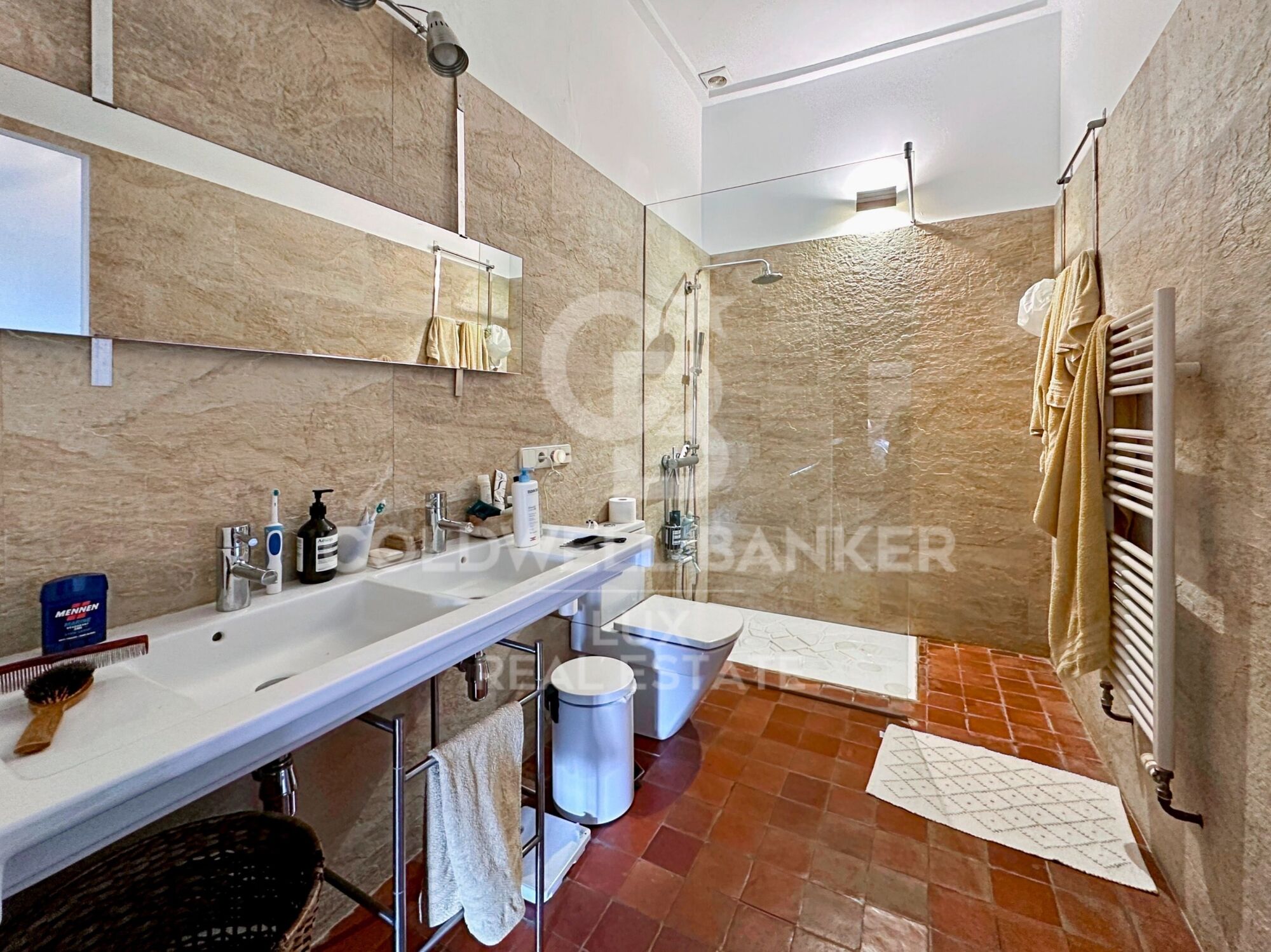 La segunda y última planta le recibe con una encantadora sala de estar equipada con chimenea y aire acondicionado, que también podría utilizarse como habitación adicional. Aquí, encontrará una habitación individual y la majestuosa master suite con vestidor y baño, con acceso a una amplia terraza con vistas al mar y al jardín.