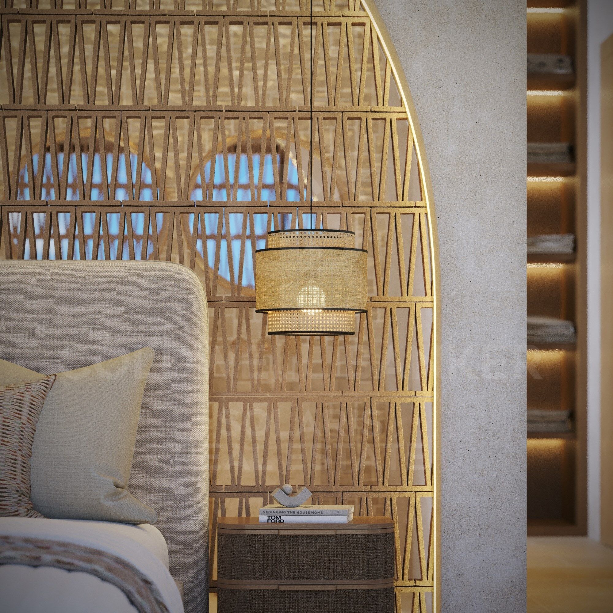 El interior refinado de la villa cuenta con microcemento en los baños y en todos los pisos, además de ventanas de aluminio doble acristalamiento de color oxidado. Las habitaciones están equipadas con persianas eléctricas exteriores y los baños con grifería negra, añadiendo un toque moderno y elegante.