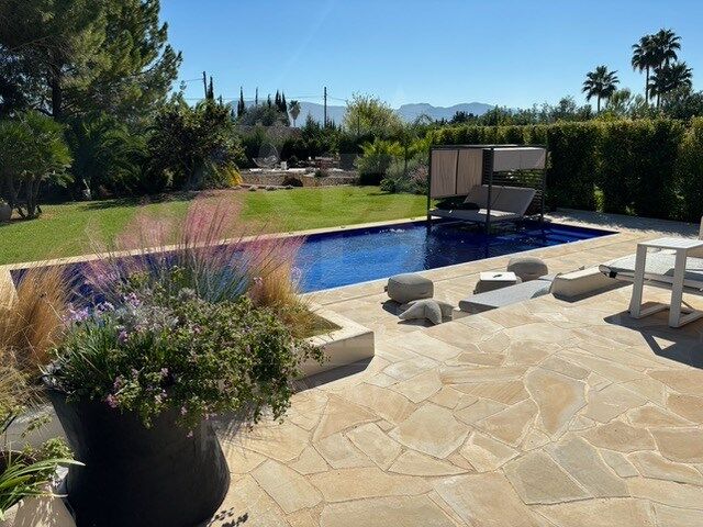 La vivienda principal cuenta con tres suites, un amplio salón y una cocina moderna con isla y barra alta para comer, diseñada para compartir momentos en familia o con amigos. Fue completamente rediseñada en 2022 en un elegante estilo mediterráneo contemporáneo por Jessica Bataille Interior Design, utilizando materiales naturales y tonos suaves que conectan armoniosamente el interior con las terrazas, la piscina y el jardín.