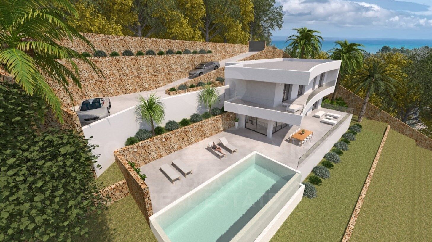 El exterior de la villa ha sido cuidadosamente diseñado para el disfrute del clima mediterráneo y para mantener un jardín de bajo mantenimiento, ideal para quienes buscan espacios verdes sin complicaciones. La propiedad incluye una piscina infinita de 5x9 m, perfecta para relajarse, nadar o simplemente disfrutar del entorno. Además, una amplia terraza de 140 m² ofrece un espacio ideal para tomar el sol, organizar reuniones al aire libre o disfrutar de cenas con vistas al mar, todo ello en un ambiente de tranquilidad y privacidad.
