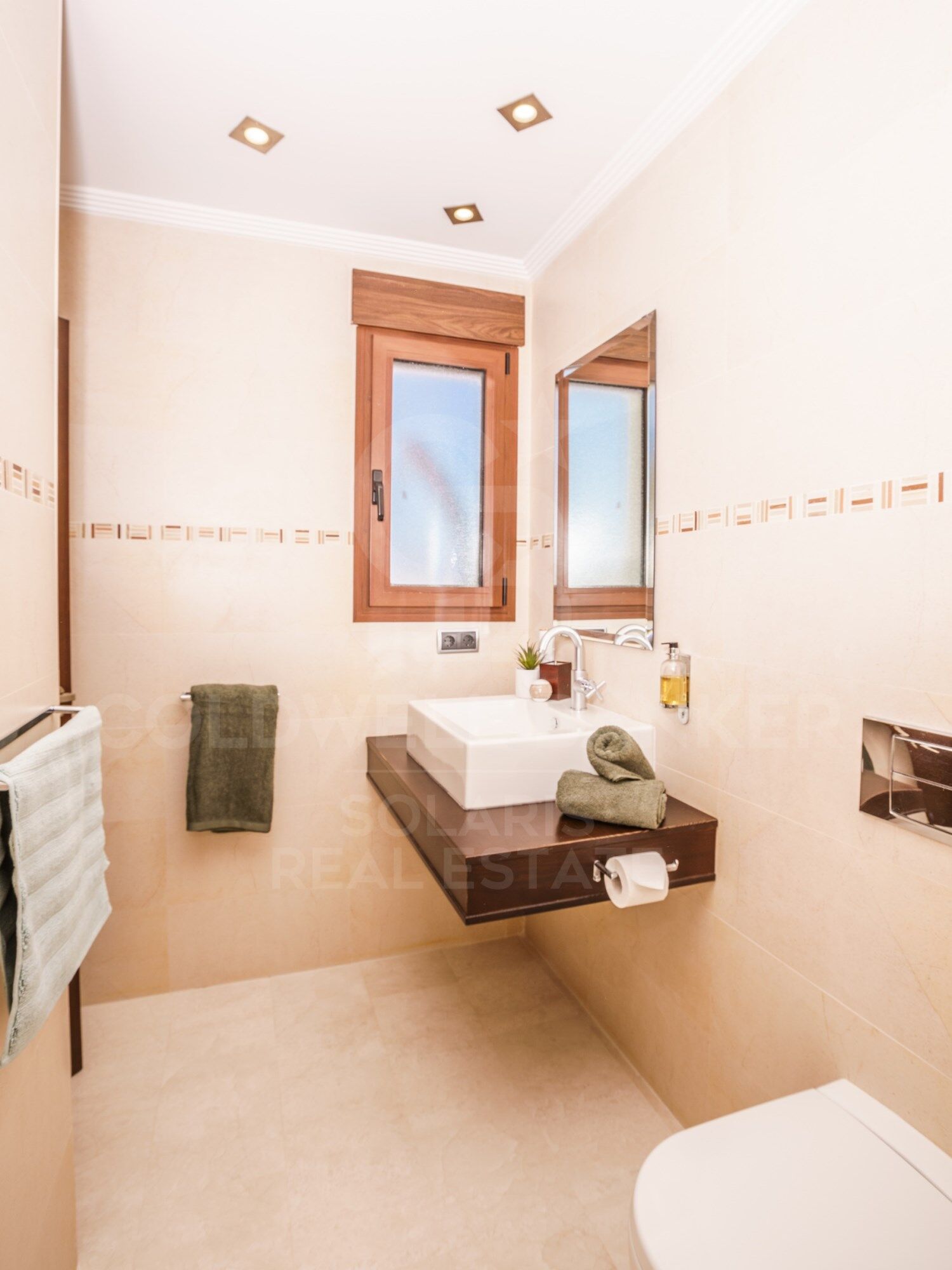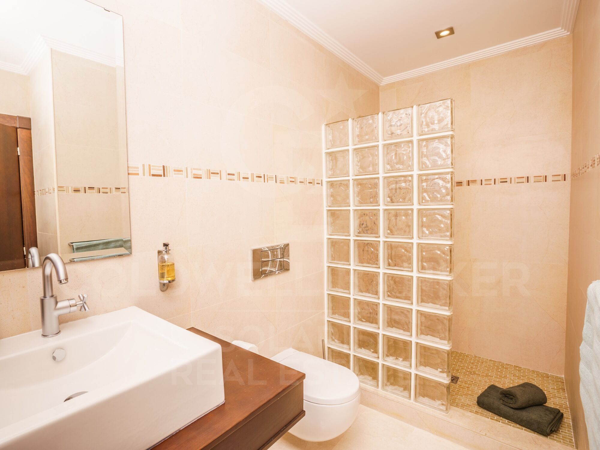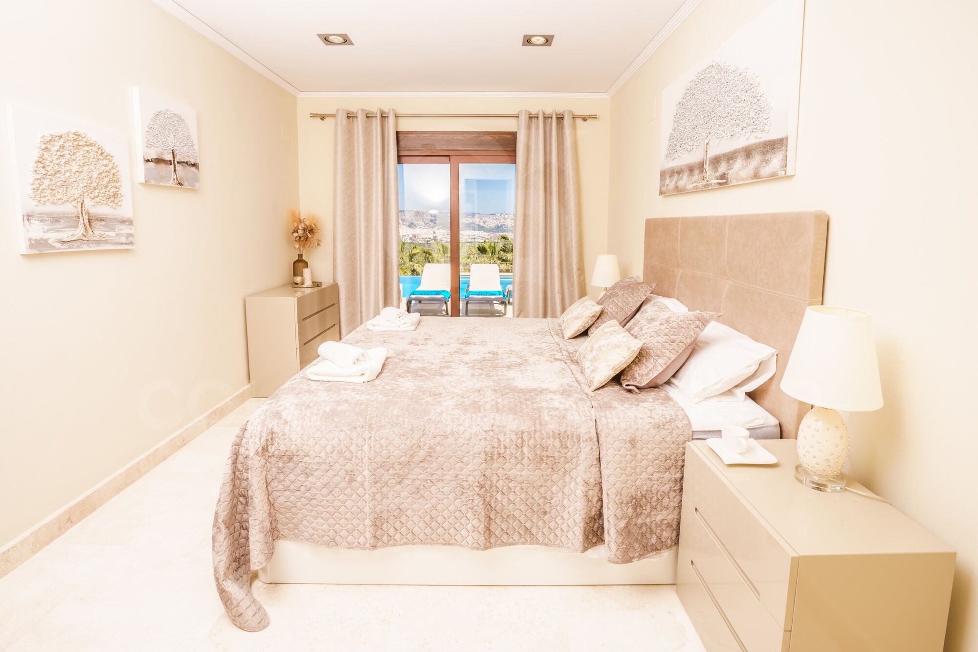 En la planta baja se encuentran 3 dormitorios dobles, todos con baño en suite (uno con bañera y ducha, los otros dos con ducha). Dos de estos dormitorios tienen acceso directo a la terraza de la piscina. Todas las ventanas de los dormitorios están equipadas con mosquiteras.