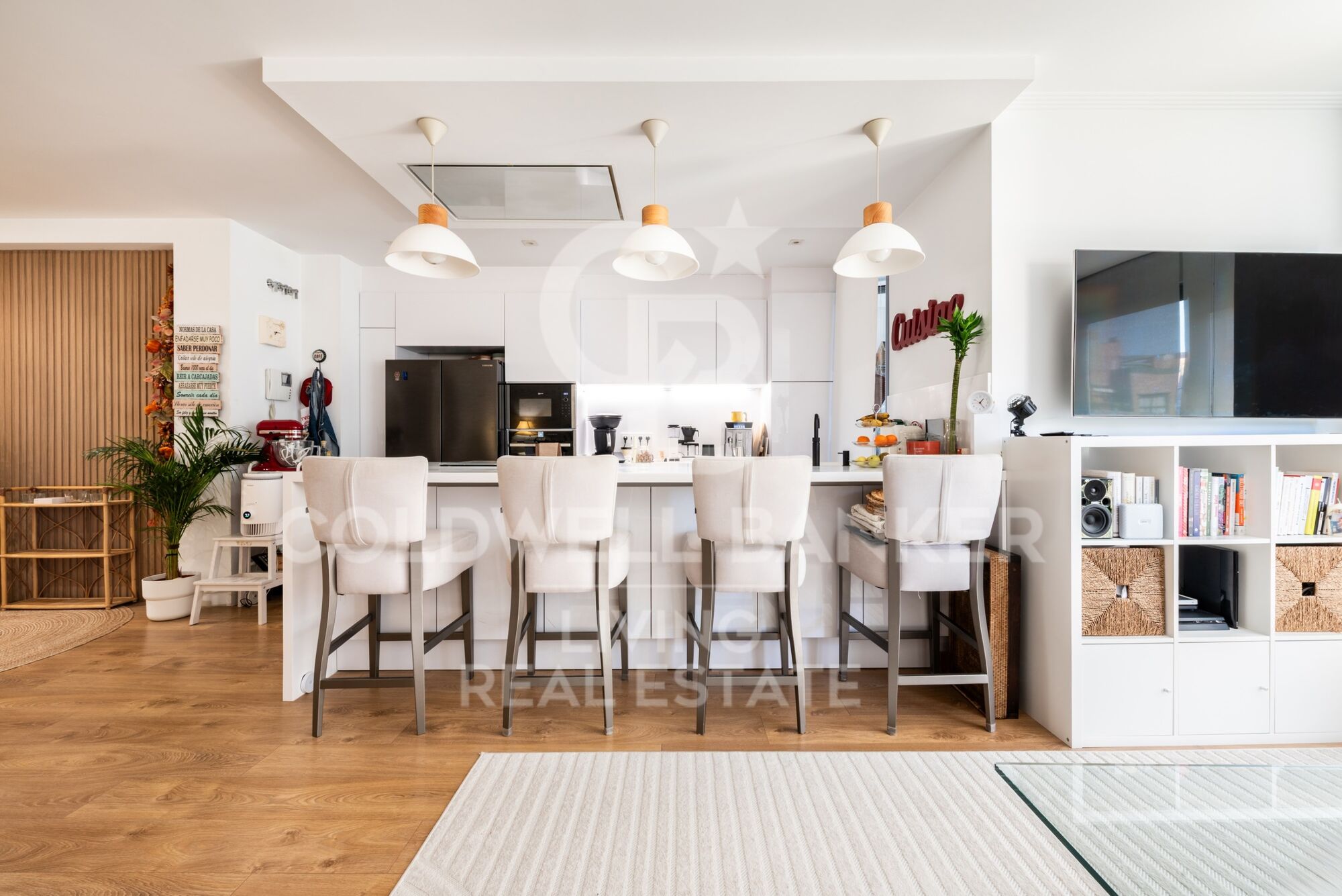 La cocina, de diseño contemporáneo, cuenta con zona de office y está totalmente equipada, con mobiliario a medida y amplias superficies de trabajo. Además, dispone de zona de lavandería y tendedero cubierto con ventilación natural al exterior.