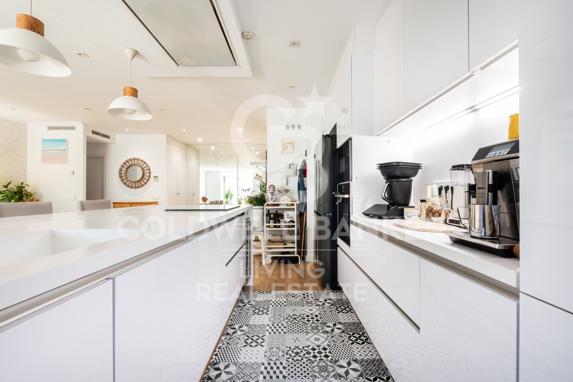 La cocina, de diseño contemporáneo, cuenta con zona de office y está totalmente equipada, con mobiliario a medida y amplias superficies de trabajo. Además, dispone de zona de lavandería y tendedero cubierto con ventilación natural al exterior.