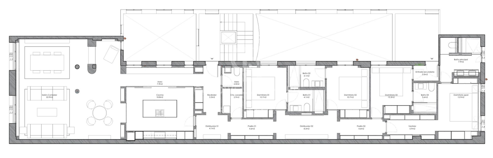 El diseño interior gira en torno a un distribuidor central coronado por una espectacular cúpula que aporta carácter y elegancia. La habitación principal destaca por su gran vestidor y un baño compartimentado con ducha y bañera, mientras que las habitaciones secundarias cuentan con un baño espacioso con áreas separadas. El proyecto incluye también una zona de lavandería independiente.