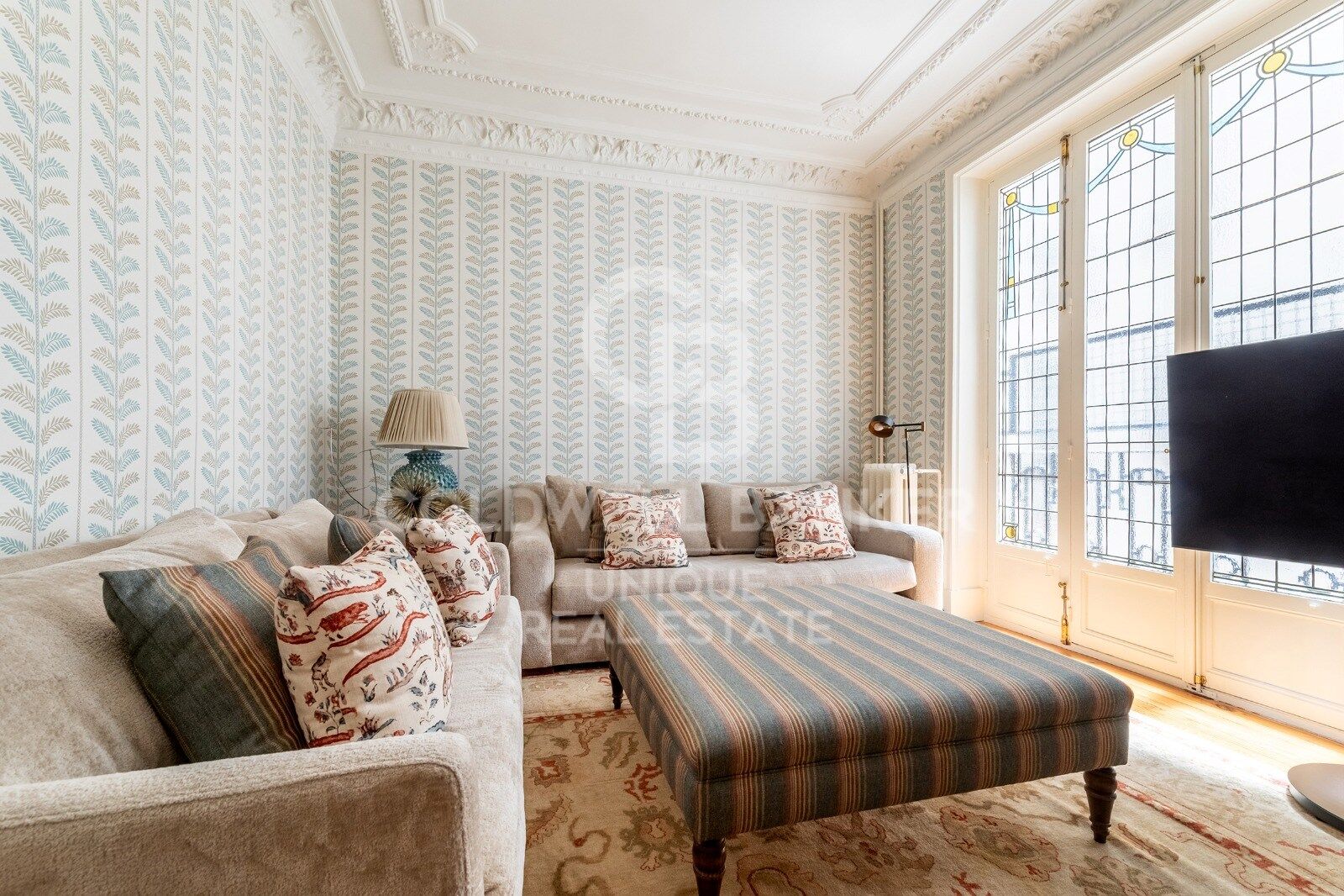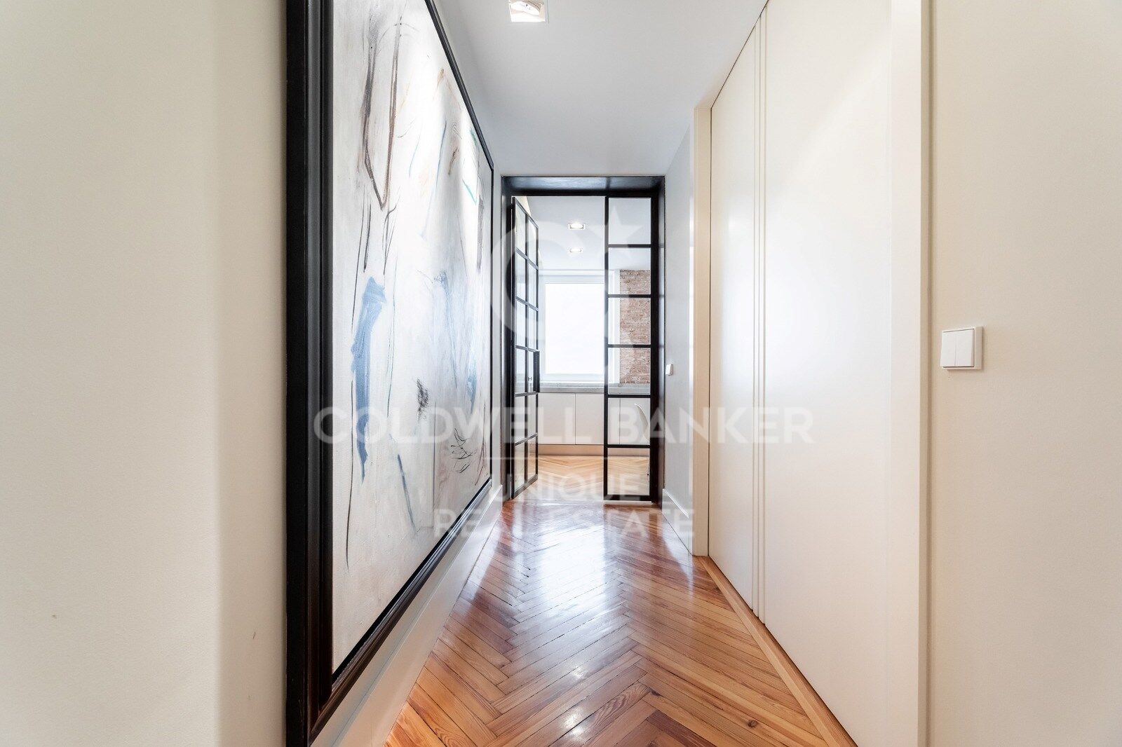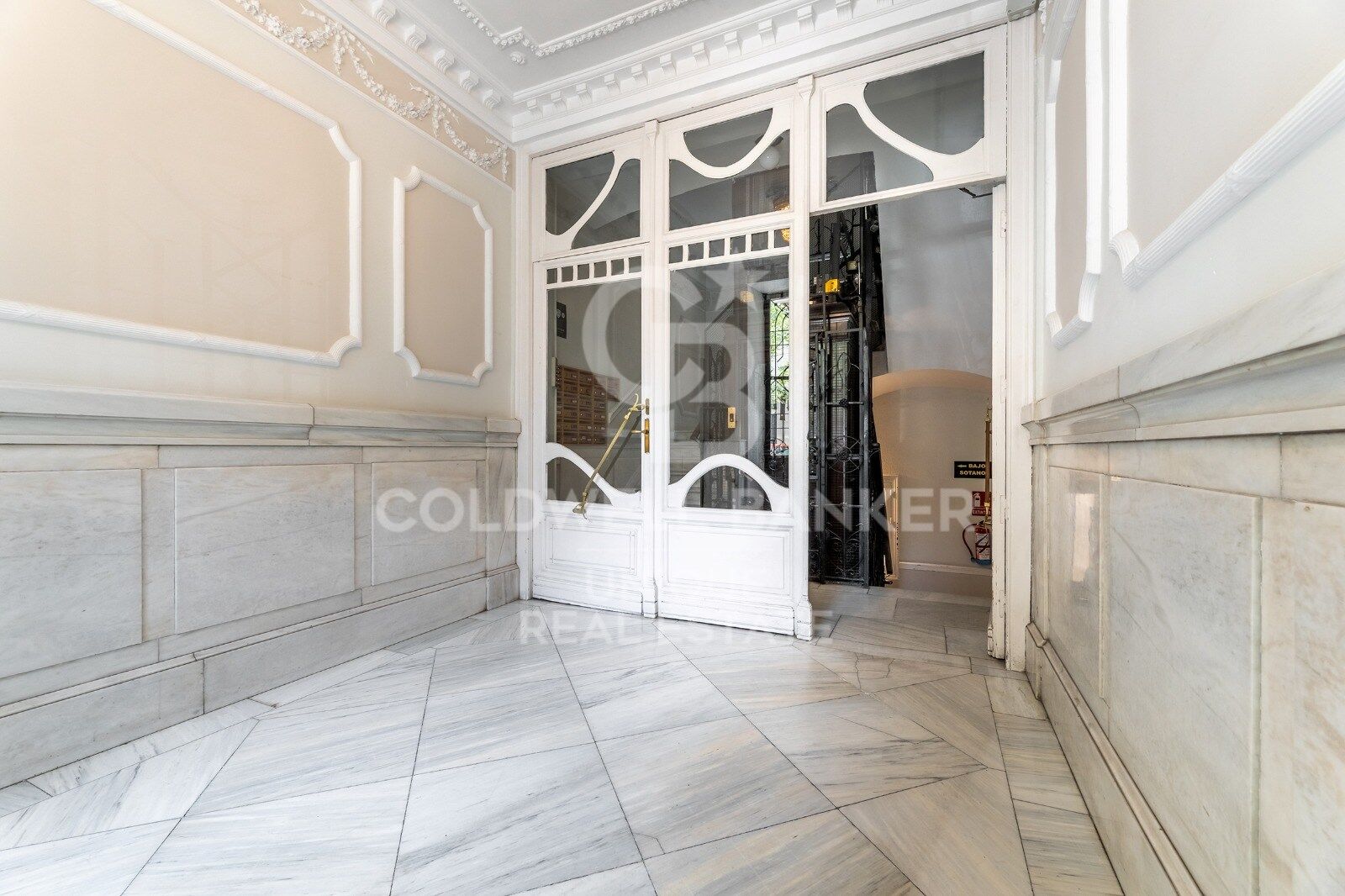 La distribución comienza con un elegante hall de entrada que da acceso a un aseo de cortesía y conduce hacia un imponente salón-comedor, bañado por una magnífica luz gracias a sus cuatro balcones a la calle. La zona privada se compone de un dormitorio principal de gran tamaño, equipado con vestidor y un cuarto de baño en suite que garantizan confort e intimidad.