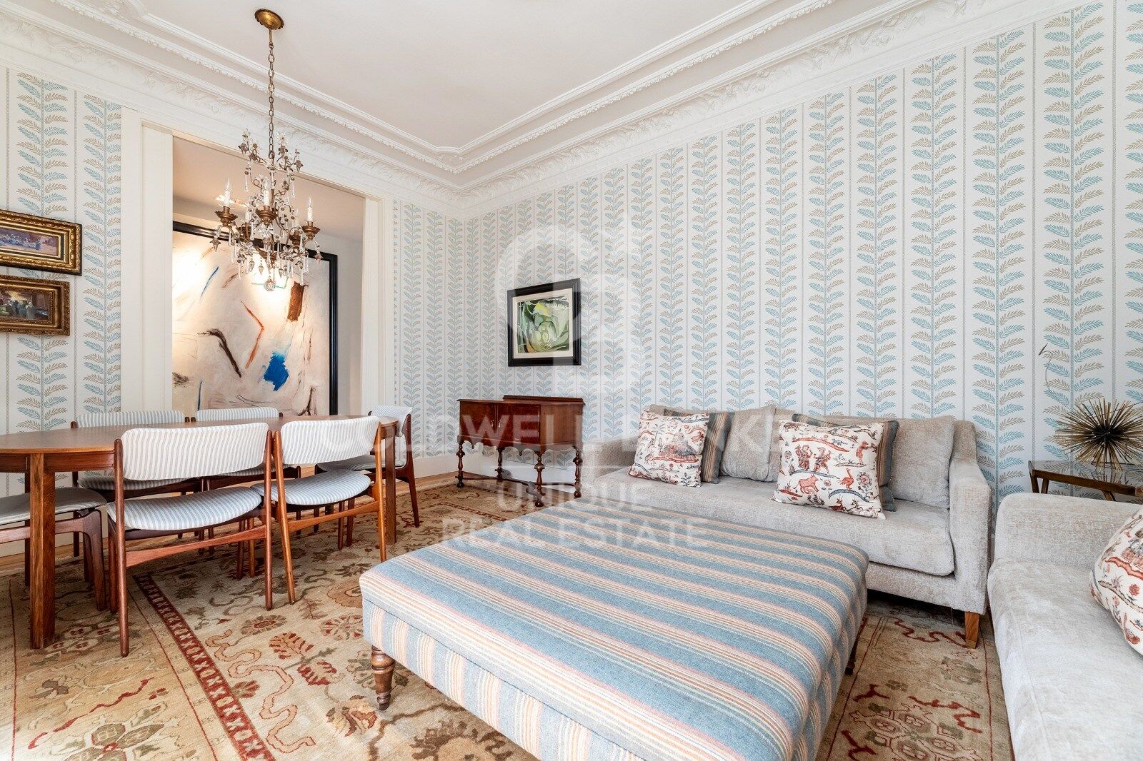 La vivienda impresiona desde el primer momento gracias a la generosa altura de sus techos, superiores a los 3,20 metros, decorados con molduras originales que aportan distinción y una sensación de amplitud incomparable. La luminosidad natural y las vistas despejadas se combinan para reforzar aún más el atractivo de cada estancia.