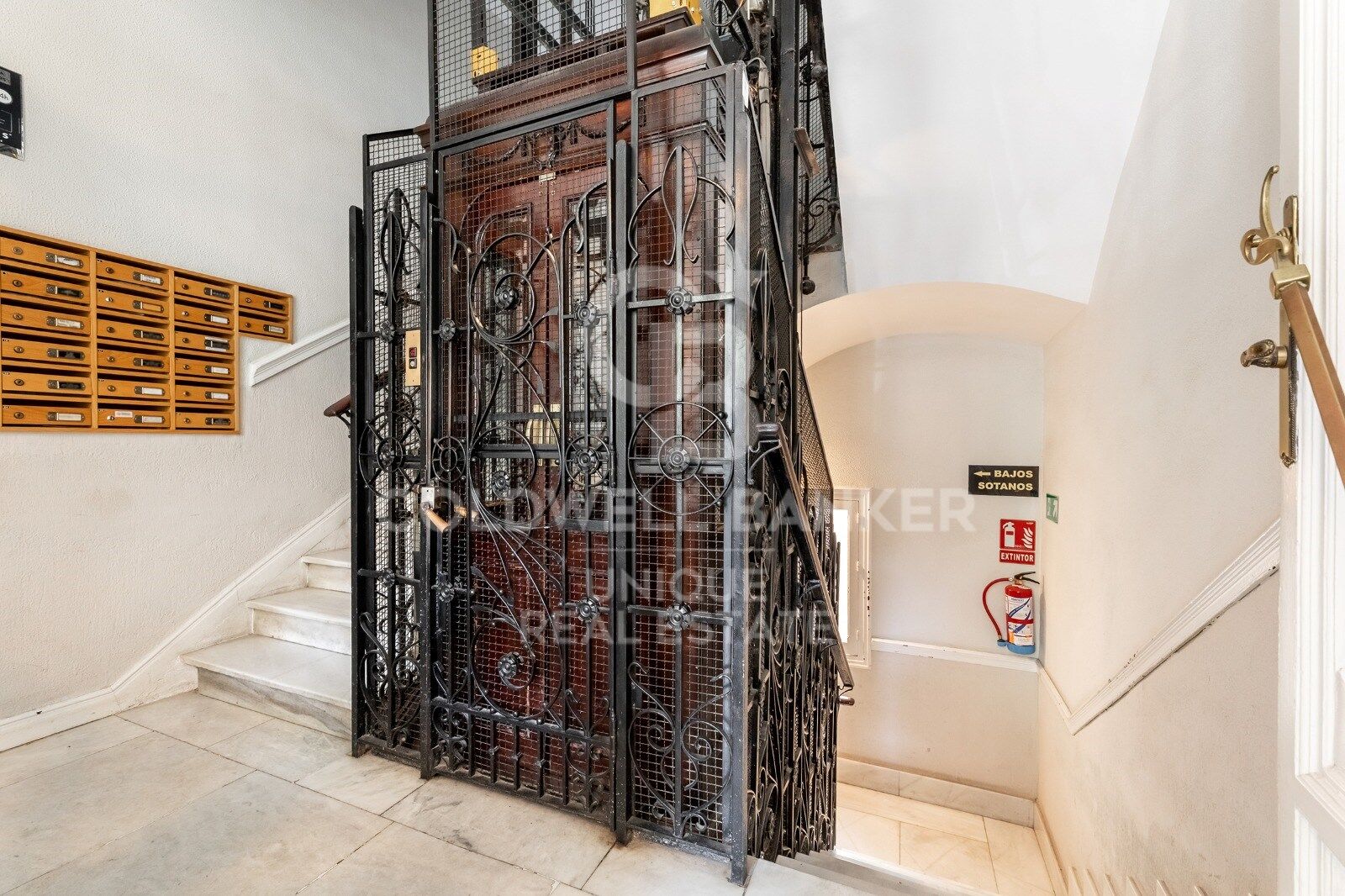 La finca destaca por su elegante fachada, su portal representativo y un icónico ascensor de jaula que realza su carácter único y atemporal.