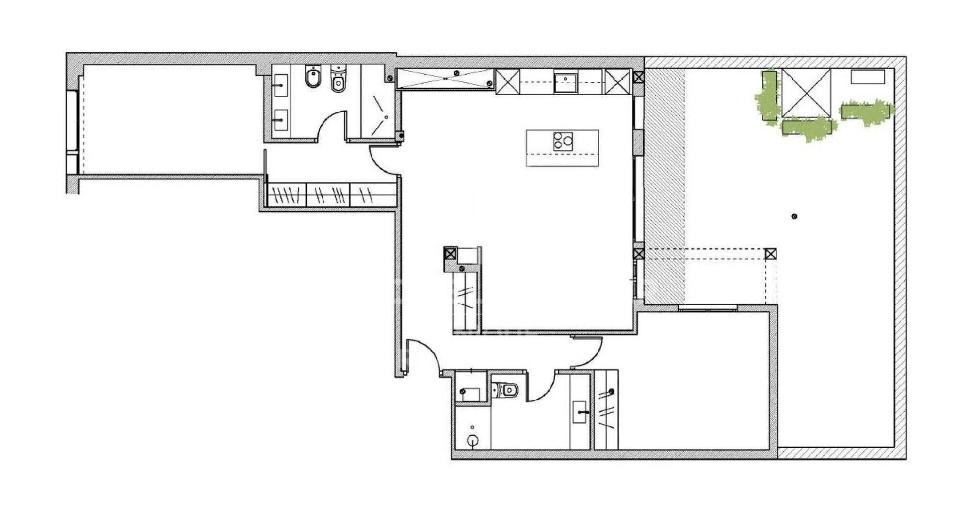 Dispone de dos dormitorios, dos baños completos y un amplio salón con cocina americana, creando un espacio moderno, funcional y muy luminoso, con orientación tanto a la calle como a la terraza.