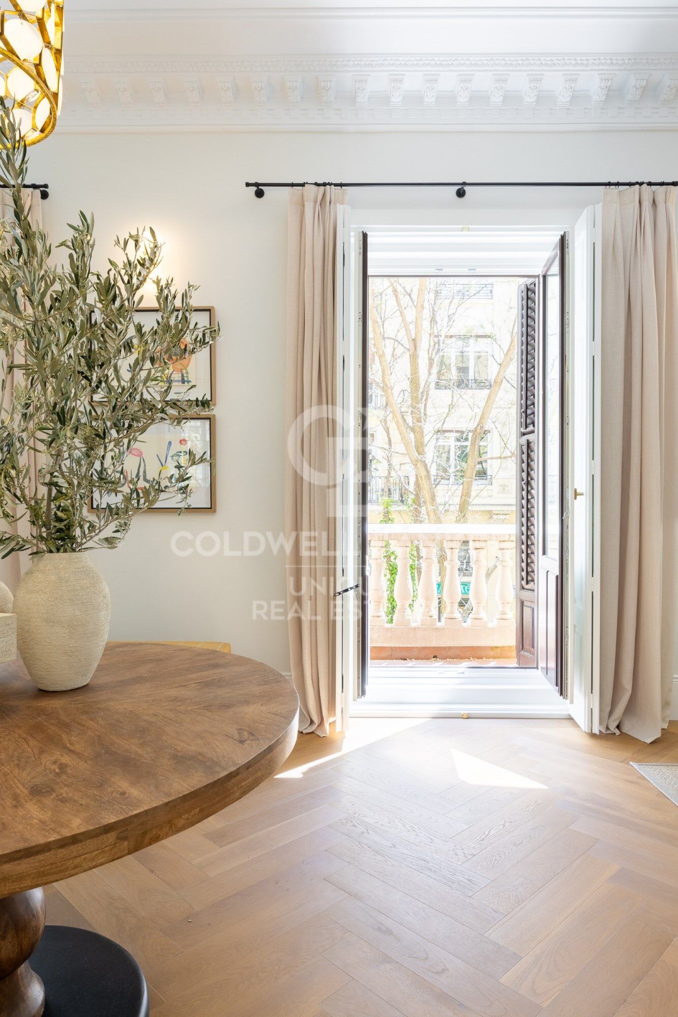 Situada en la planta principal de un imponente edificio clásico de principios del siglo XX, esta residencia, completamente reformada y amueblada a estrenar, ofrece 471m² de lujo contemporáneo combinados con el esplendor de la arquitectura tradicional. La espectacular altura de techos de 3,70 metros, junto a sus 14 balcones a la calle, otorgan una luz y una presencia excepcionales a todos los espacios.