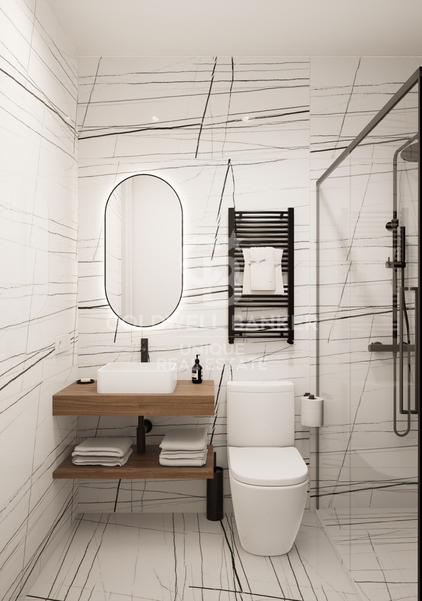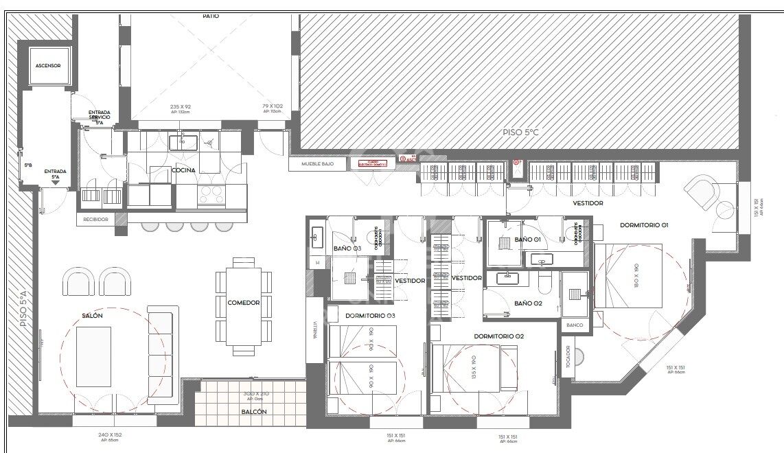 Ubicado en la quinta planta, cuenta con una superficie construida de 151 m² distribuidos en tres habitaciones y tres baños completos.