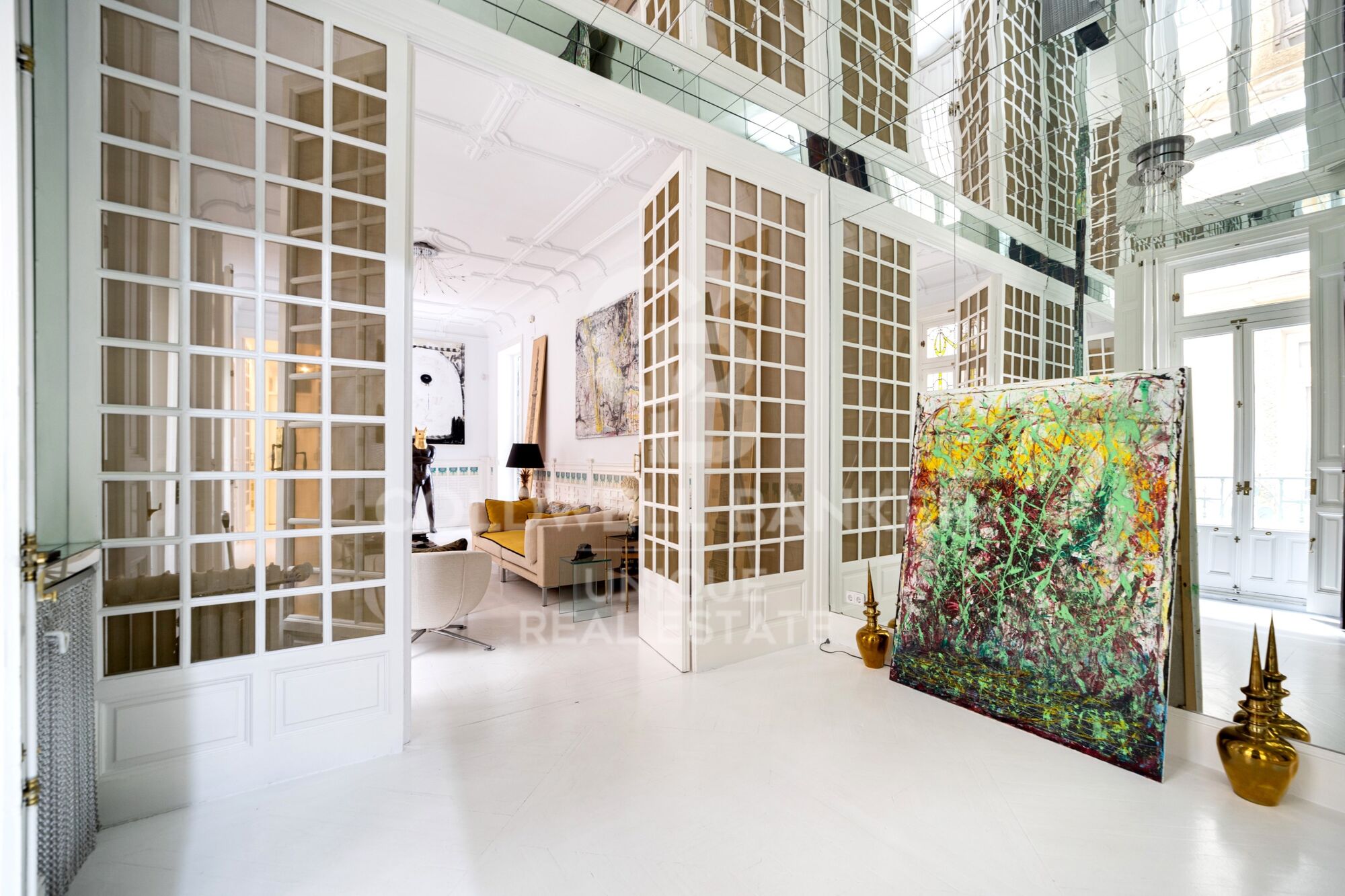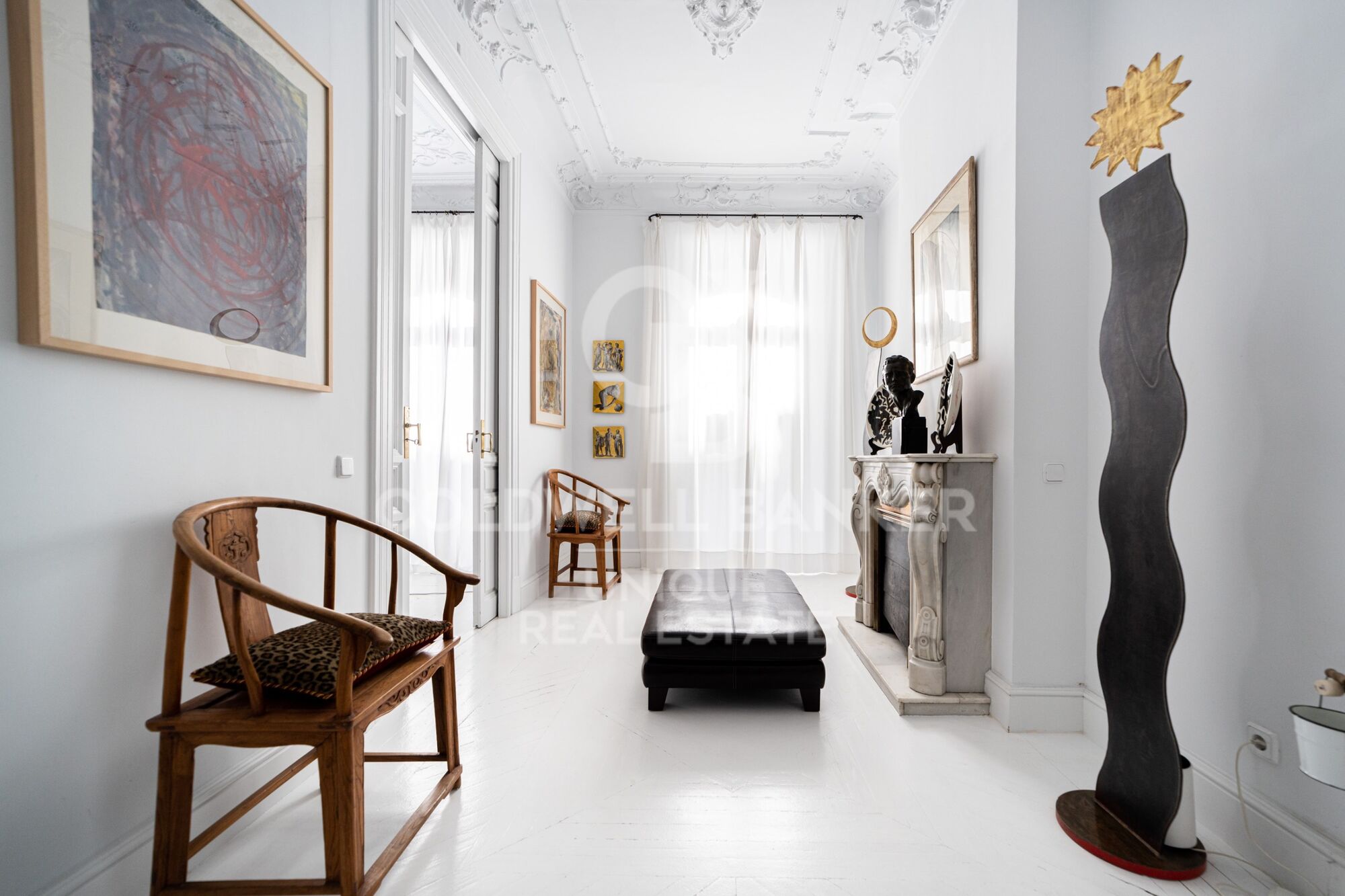 La vivienda, ubicada en la segunda planta de un edificio emblemático de la zona con portero, se compone de 3 salones, uno de ellos con tres ventanales exteriores, 4 habitaciones, una moderna cocina comedor y 3 baños. El dormitorio principal gracias a su balcón a la calle goza de mucha luz y beneficia de su proprio baño en suite. Las otras habitaciones dan a patios interiores muy cuidados y silenciosos.