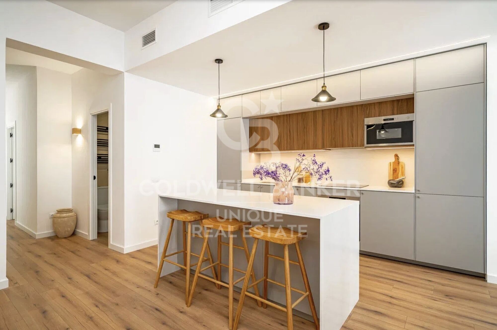 La vivienda, con 179 m² construidos (163 m² útiles), cuenta con una distribución amplia y luminosa. Al acceder, se abre un espacio diáfano que integra el salón, el comedor y la cocina con isla central, un ambiente que destaca por sus techos altos, sus dos balcones exteriores con vistas despejadas y su cuidada decoración.