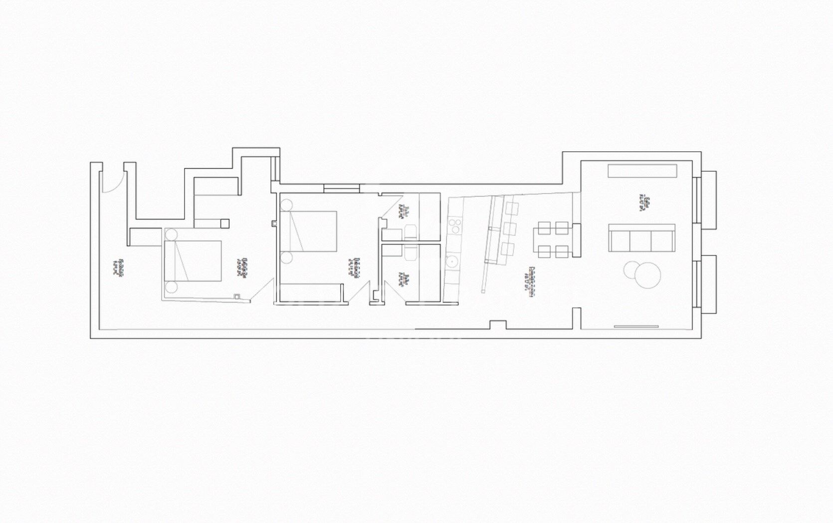 La zona de descanso, perfectamente diferenciada, cuenta con dos dormitorios y dos baños completos, uno de ellos en suite, garantizando privacidad y comodidad. La reforma integral ha sido realizada con materiales de primera calidad y un cuidado diseño que combina acabados modernos con un toque cálido y sofisticado. La vivienda dispone de armarios empotrados, aire acondicionado, trastero y se encuentra en una tercera planta exterior, dentro de un edificio representativo con ascensor.