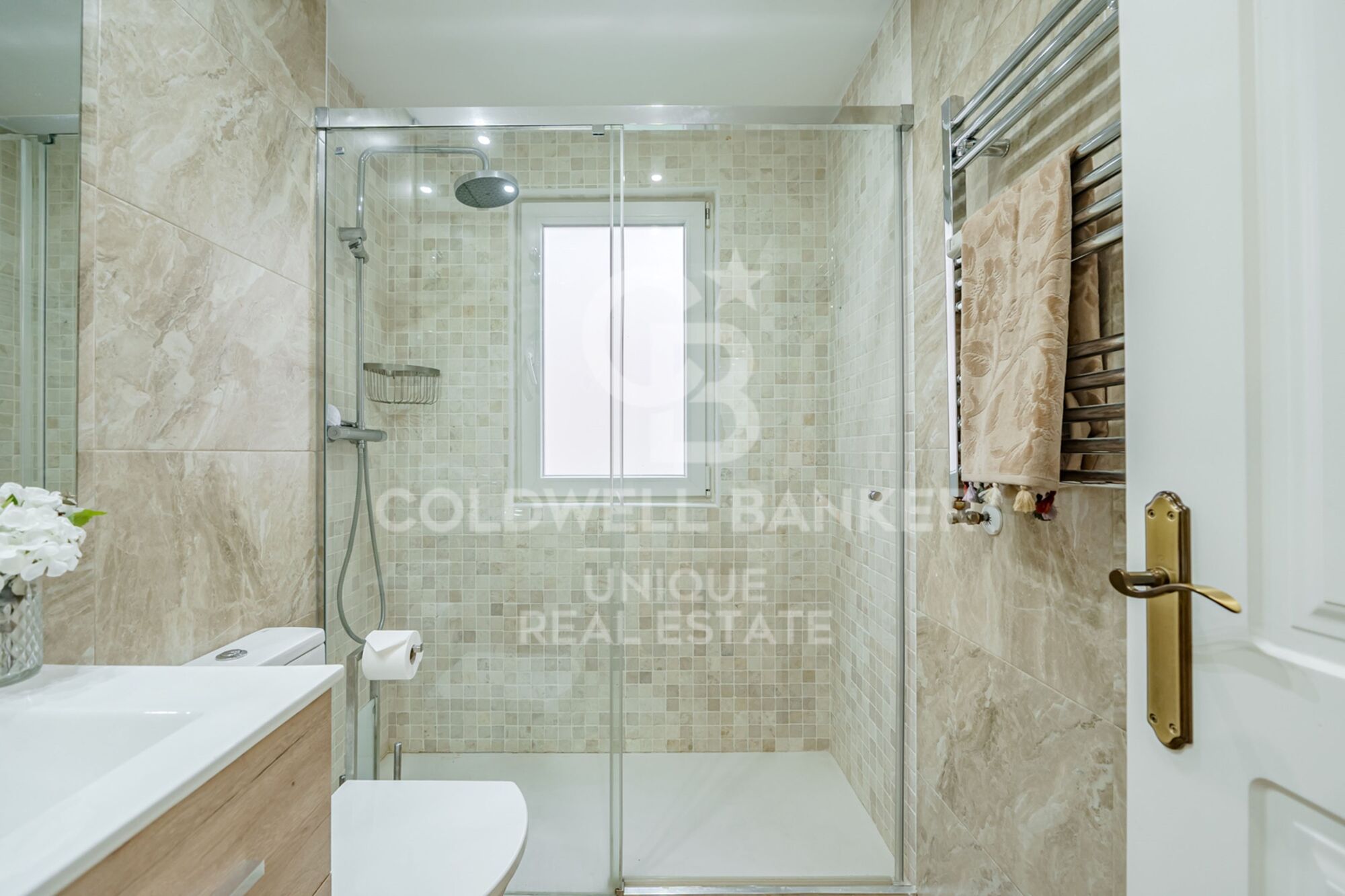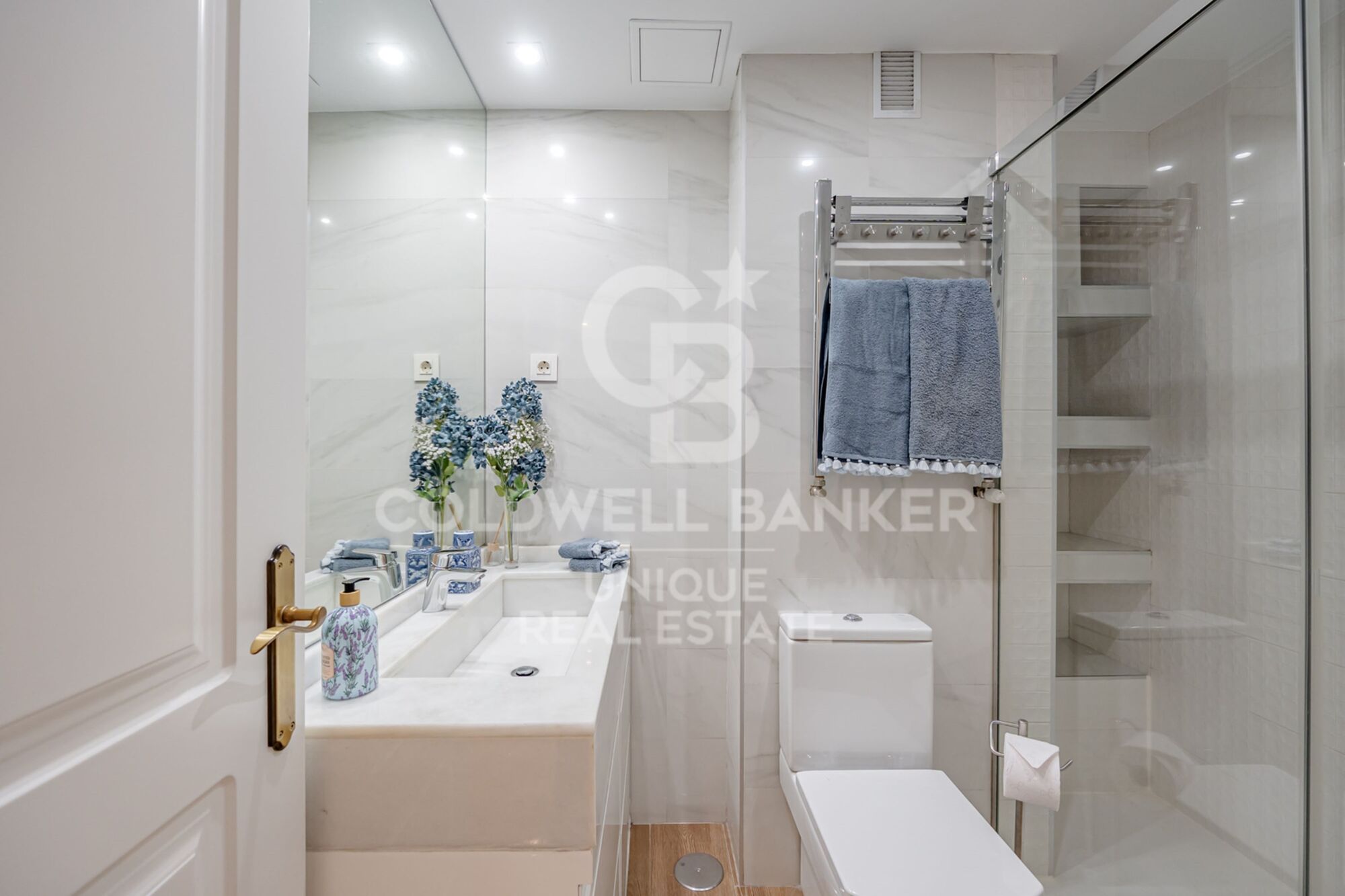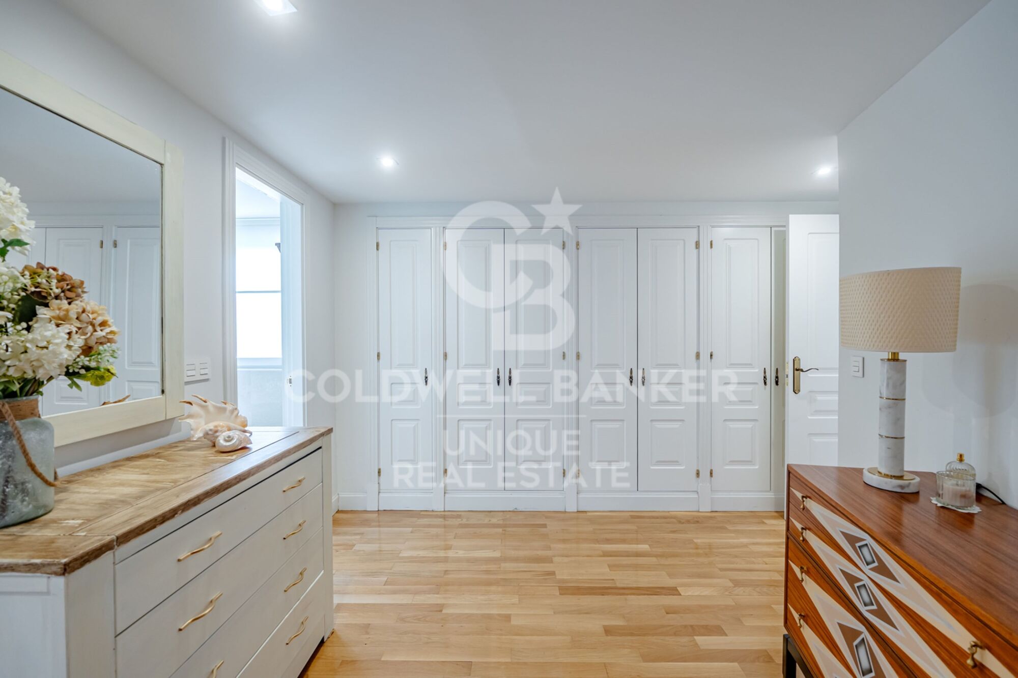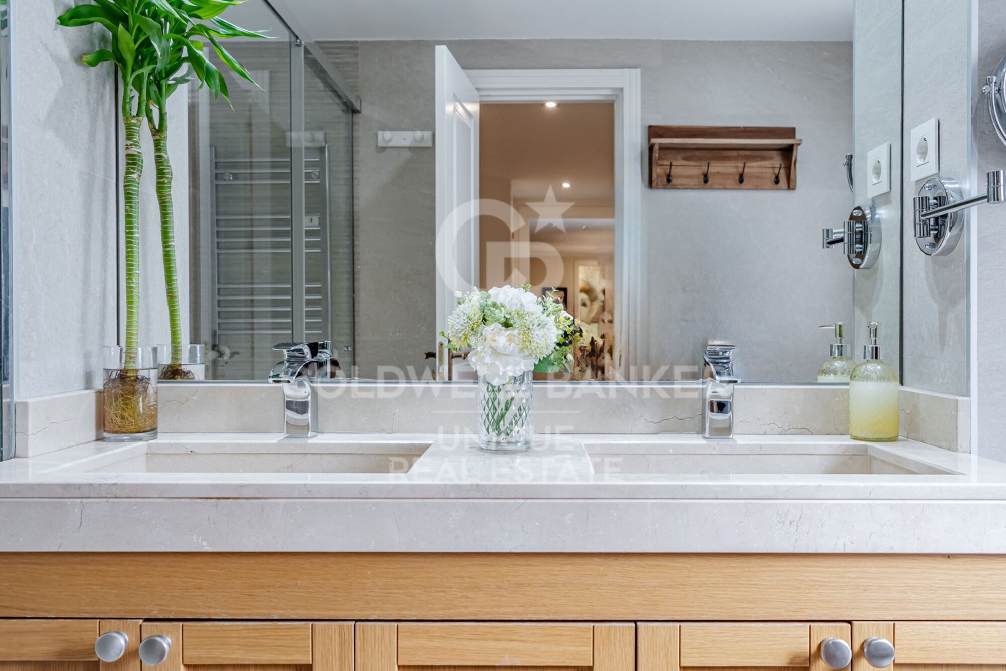 Desde el hall accedemos también al dormitorio principal, de gran tamaño, exterior y muy luminoso, con una cómoda zona de despacho junto a los ventanales y un cuarto de baño en suite con luz natural, revestido en elegante mármol travertino. En esta zona social se encuentra además un aseo de cortesía, ideal para invitados.