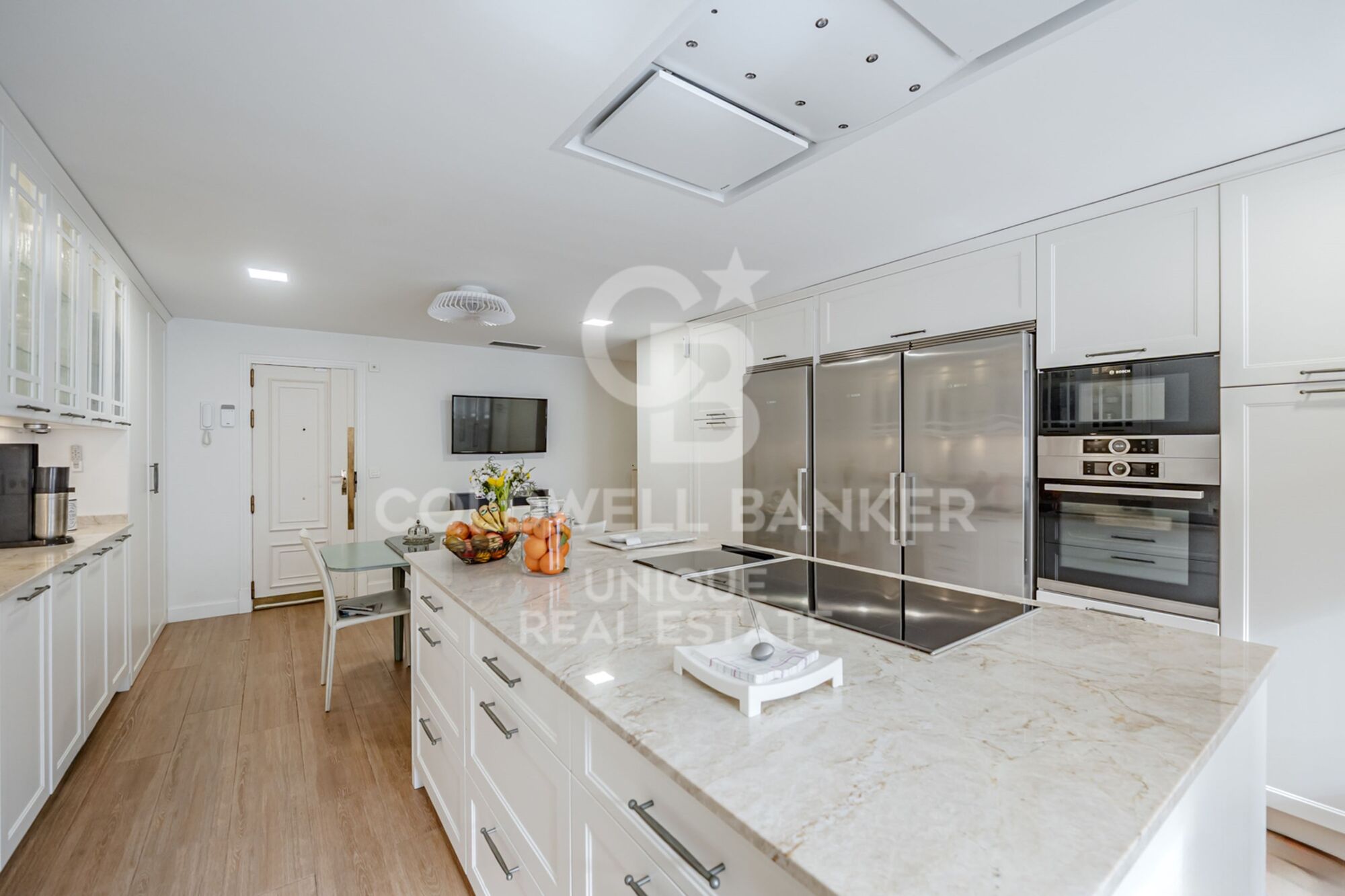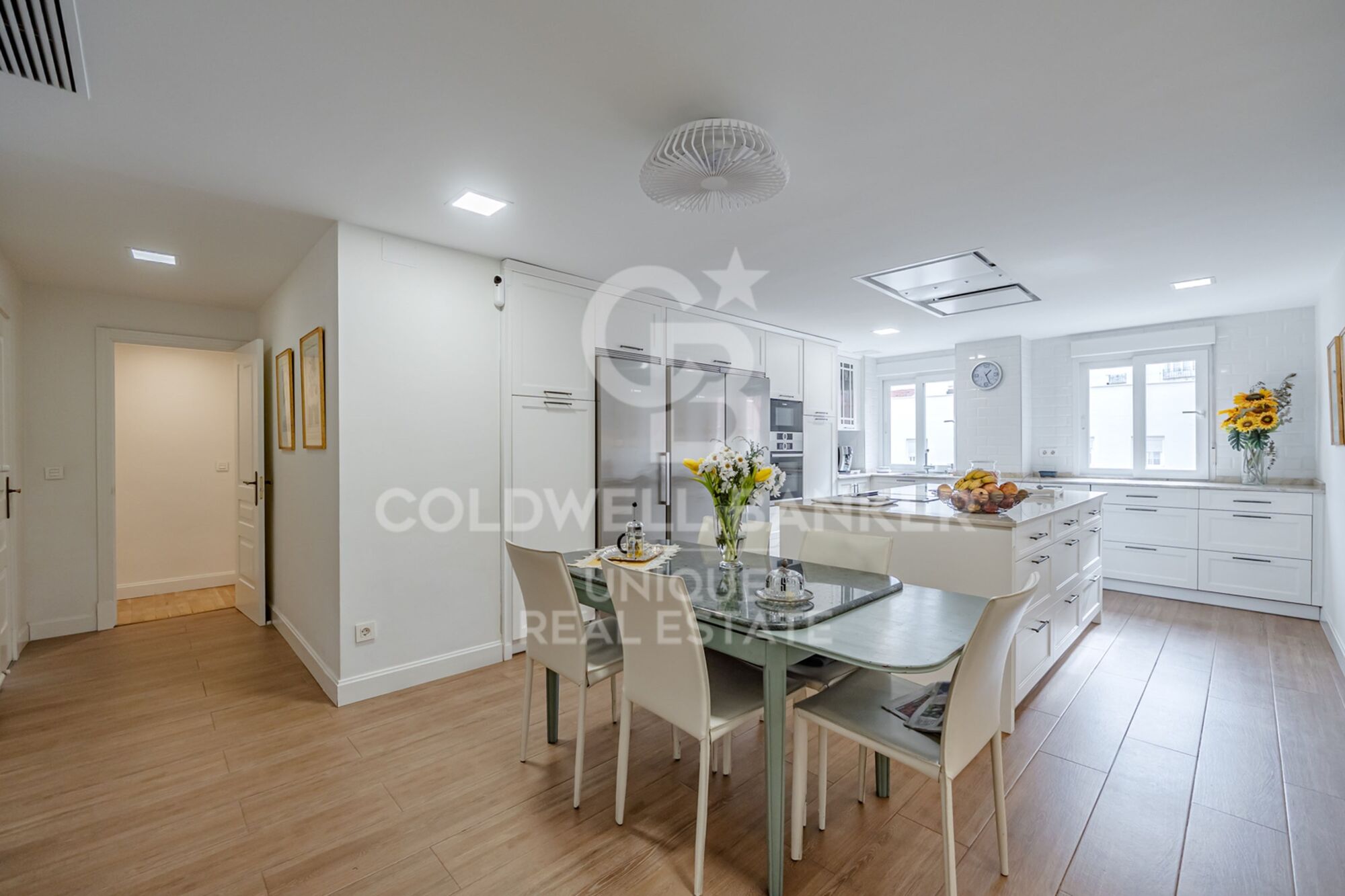 La zona privada de la vivienda se organiza a través de un pasillo que conduce a un dormitorio individual, dos dormitorios dobles y dos baños completos, todos ellos reformados con materiales nobles. Destaca la espectacular cocina independiente de más de 30 m², muy luminosa y con gran capacidad de almacenaje, equipada con electrodomésticos Bosch, gran isla central con inducción y grill, zona de office, lavandería/despensa, cuarto multifuncional y puerta de servicio con acceso directo a escalera y ascensor de servicio.