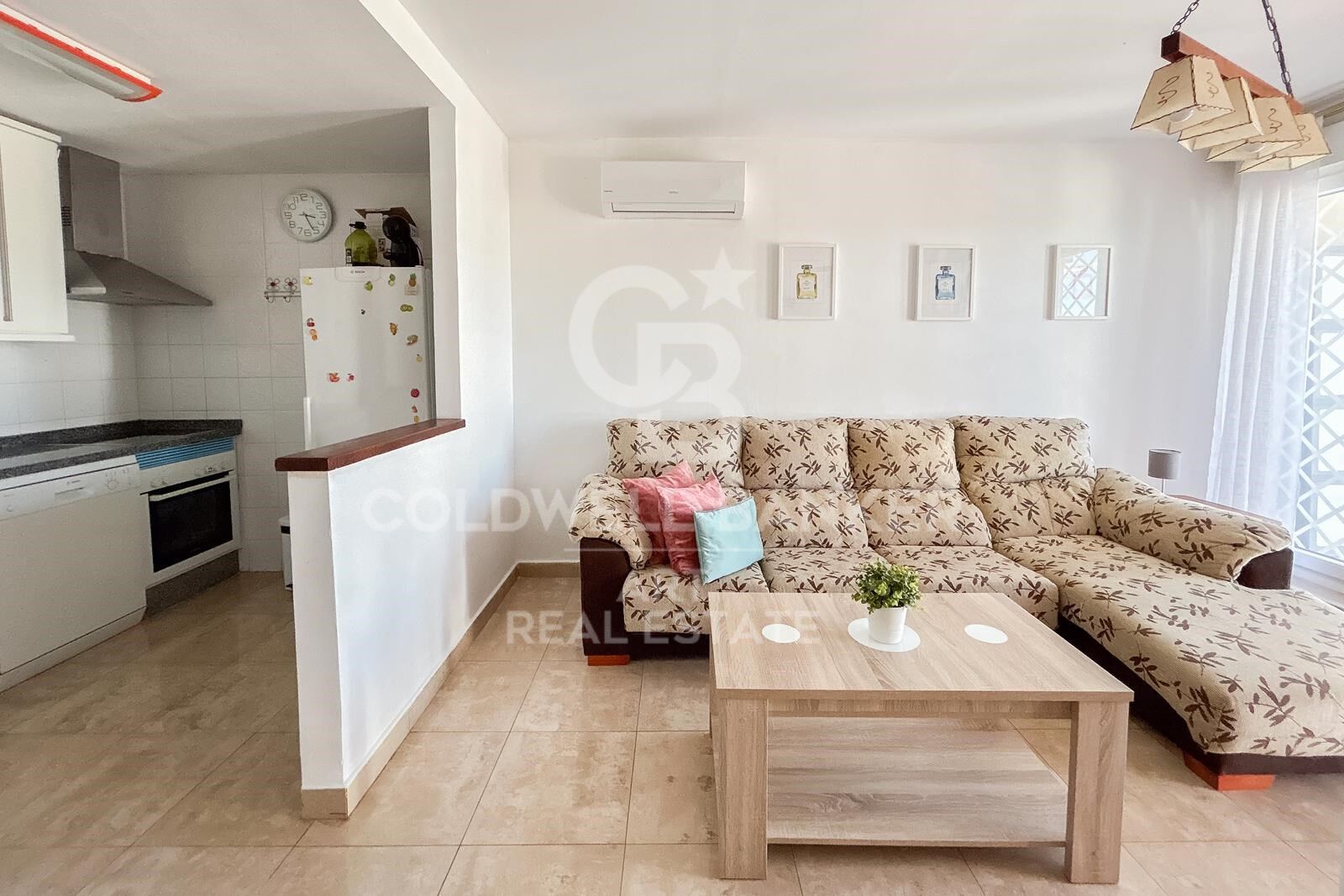El interior presenta un diseño contemporáneo de planta abierta que integra de forma fluida la cocina, el salón y el comedor, creando un ambiente armonioso y acogedor. La vivienda se vende completamente amueblada y equipada, con armarios empotrados, ventanas de PVC con doble acristalamiento Climalit y aire acondicionado frío/calor tipo split en todas las estancias.