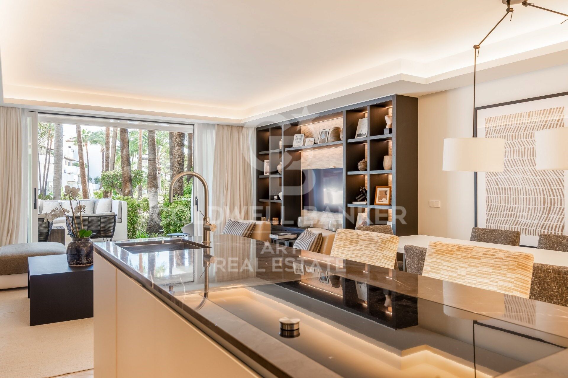 Este apartamento recientemente reformado en planta baja es la personificación del lujo en estilo de vida resort, ubicado en una posición privilegiada dentro del exclusivo Puente Romano Resort en la renombrada Milla de Oro de Marbella. Cada aspecto del diseño ha sido cuidadosamente considerado para crear una perfecta fusión de elegancia y funcionalidad, con una atención meticulosa al detalle en todos los espacios. Los materiales y acabados son de la más alta calidad, con losas de gran formato de marcas prestigiosas como Porcelanosa y Ascale en las áreas de estar. Las ventanas de aluminio de suelo a techo de la marca Cortizo permiten el acceso directo a la terraza y llenan la propiedad de luz natural. Los espacios de salón y cocina están integrados en un concepto de open-plan, lo que permite una fluidez perfecta entre los espacios. La cocina a medida está completamente equipada con electrodomésticos de alta gama Siemens y cuenta con una impresionante isla de mármol, perfecta tanto para cocinar como para recibir invitados. El salón impresiona por su selección meticulosa de muebles y accesorios, ofreciendo una paleta de colores suaves y neutros que exudan confort y sofisticación. Las tres habitaciones cuentan con suelos de madera de primera calidad, así como aire acondicionado independiente y calefacción por suelo radiante en los baños. Los armarios y revestimientos también están construidos con carpintería de madera personalizada de la más alta calidad. Cada una de las habitaciones para invitados presenta un enfoque único de diseño interior, maximizando tanto el confort como el estilo. Todos los baños están equipados con grifería de alta calidad y toalleros calefaccionados, ofreciendo una experiencia lujosa y funcional. La habitación principal es el centro de atención, con un diseño impresionante y acabados excepcionales. Tanto el salón como la habitación principal tienen acceso directo a la terraza, que está perfectamente equipada para cenas al aire libre y áreas de descanso. La terraza ofrece vistas al resort, disfrutando de una abundante luz solar durante todo el día, creando el lugar ideal para relajarse. Con acceso conveniente a la Milla de Oro, sus servicios de lujo y la playa, este apartamento ofrece un estilo de vida inigualable, permitiendo a sus residentes sumergirse por completo en lo mejor que Marbella tiene para ofrecer. #ref:CBSH303