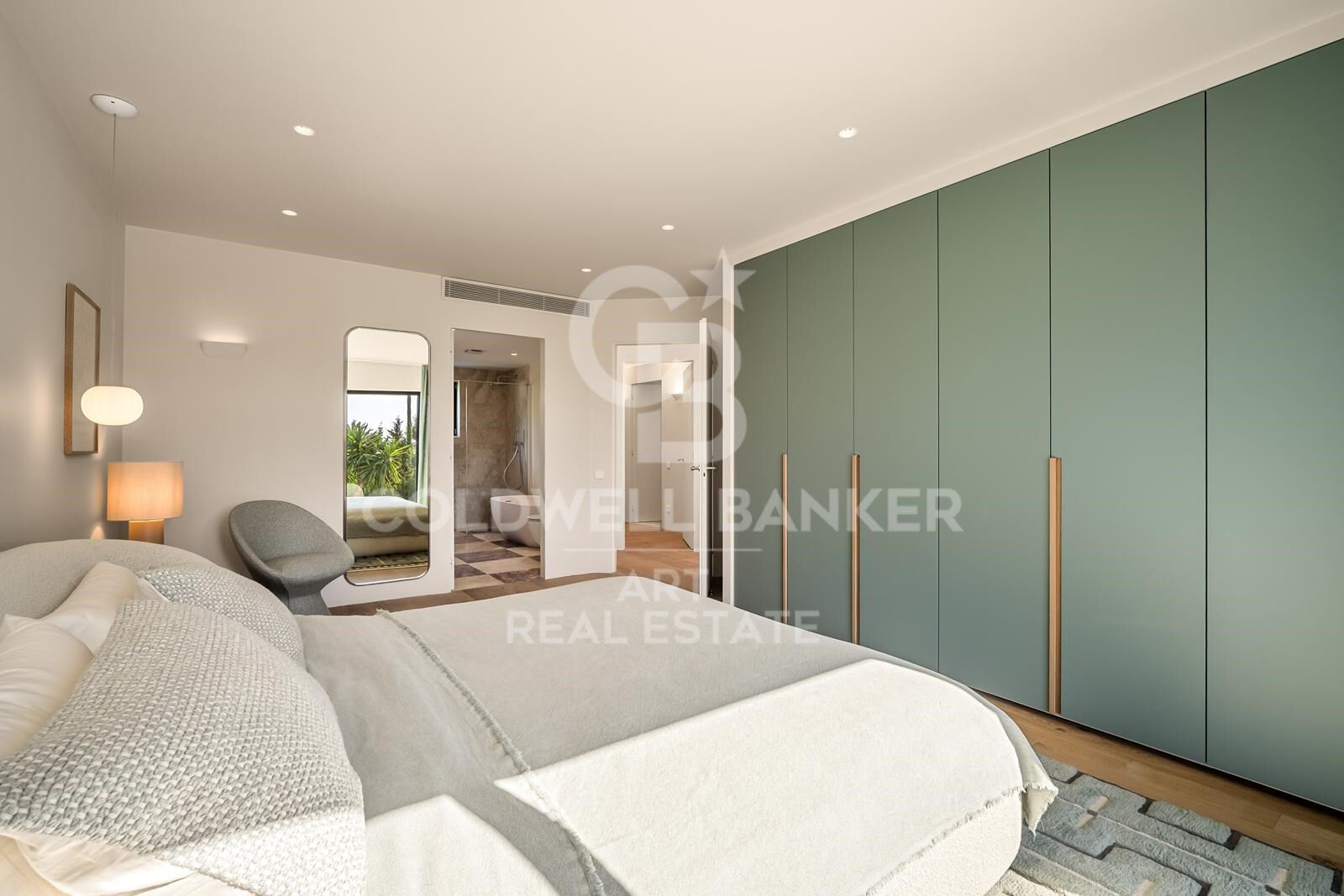 La suite principal es un verdadero santuario, con ventanales de suelo a techo que inundan el espacio de luz natural y ofrecen vistas tranquilas al jardín. El baño principal es igualmente lujoso, diseñado como un espacio de confort e indulgencia.