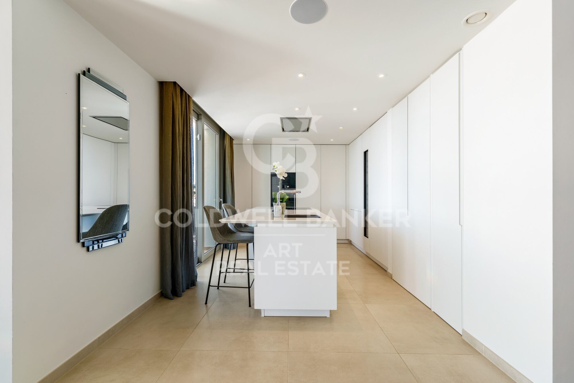 La planta principal se organiza en torno a una amplia distribución de concepto abierto que integra salón, comedor y cocina, con acceso directo a generosas terrazas. Las puertas correderas de suelo a techo permiten una excelente entrada de luz natural y crean una conexión fluida entre el interior y el exterior. La cocina moderna está completamente equipada con electrodomésticos de alta gama y acabados de líneas limpias, pensada tanto para el día a día como para el entretenimiento. Esta planta también dispone de dormitorios bien proporcionados con baños en suite, acabados con materiales refinados y una paleta de tonos neutros.
