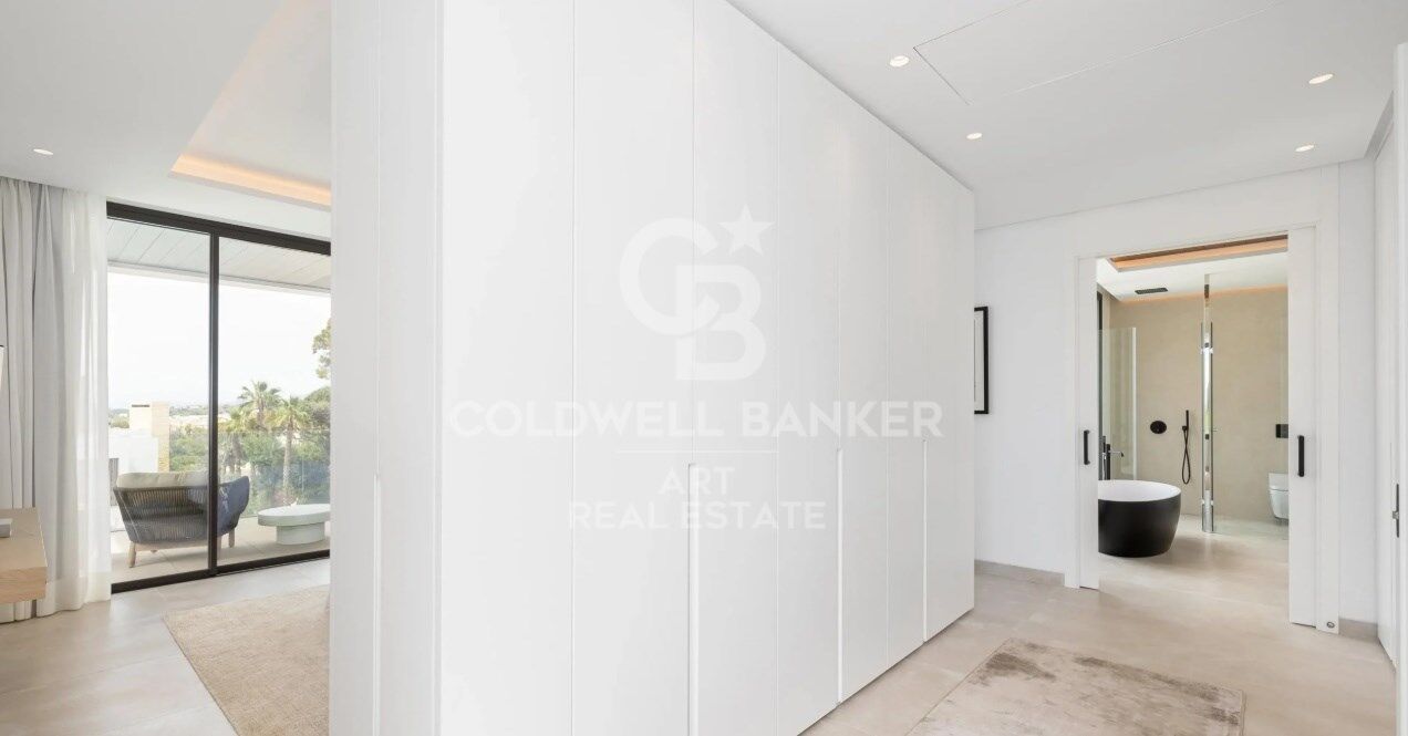 En la primera planta, la suite principal cuenta con una amplia terraza, un gran vestidor y un lujoso baño con ventanales de suelo a techo. En esta misma planta se encuentran dos dormitorios adicionales en suite, con amplios baños, espaciosos armarios y un diseño igualmente elegante.