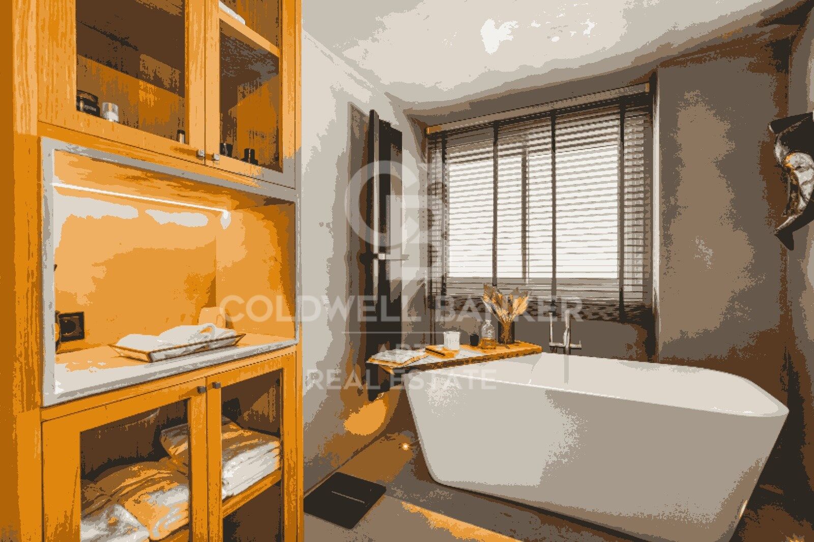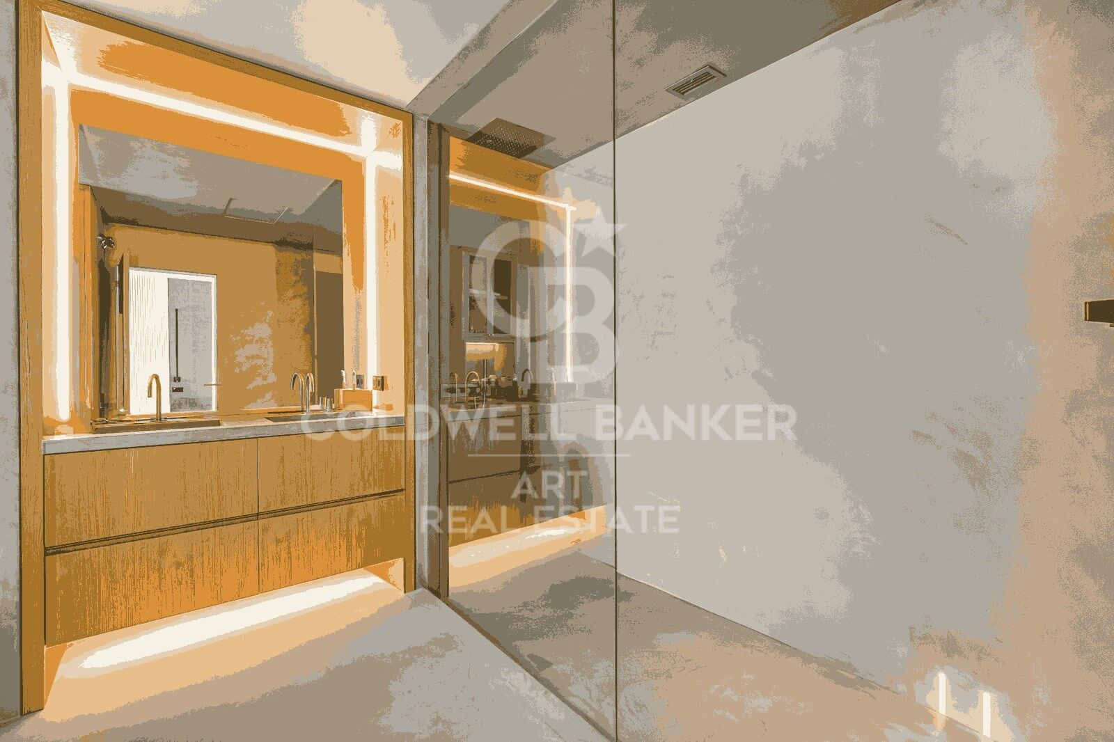 Esta amplia propiedad de 632 m2 ha sido completamente renovada con materiales de primera calidad y acabados de lujo. Accesible a través de un ascensor privado, a la entrada, uno es recibido por un gran vestíbulo que conduce a una amplia sala de estar dividida en dos secciones. La primera comprende un comedor y un aseo de invitados, mientras que la segunda cuenta con una acogedora chimenea, cómodos asientos y una extraordinaria bodega.