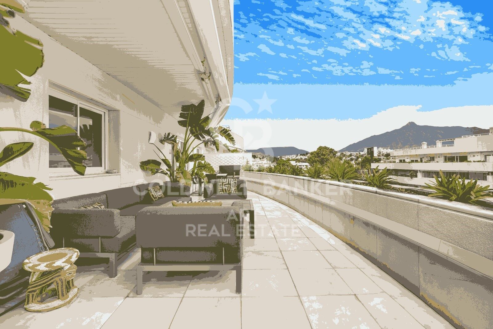 El ascenso a la planta superior revela una amplia segunda terraza que abarca aproximadamente 300 m2. Esta zona cuenta con una sala de estar totalmente cerrada y climatizada, un comedor cubierto adornado con un tema africano y una cocina totalmente equipada, que se completa con un cuarto de baño. Además, la terraza de la azotea alberga una piscina climatizada y una zona para tomar el sol, con vistas panorámicas de los alrededores.
