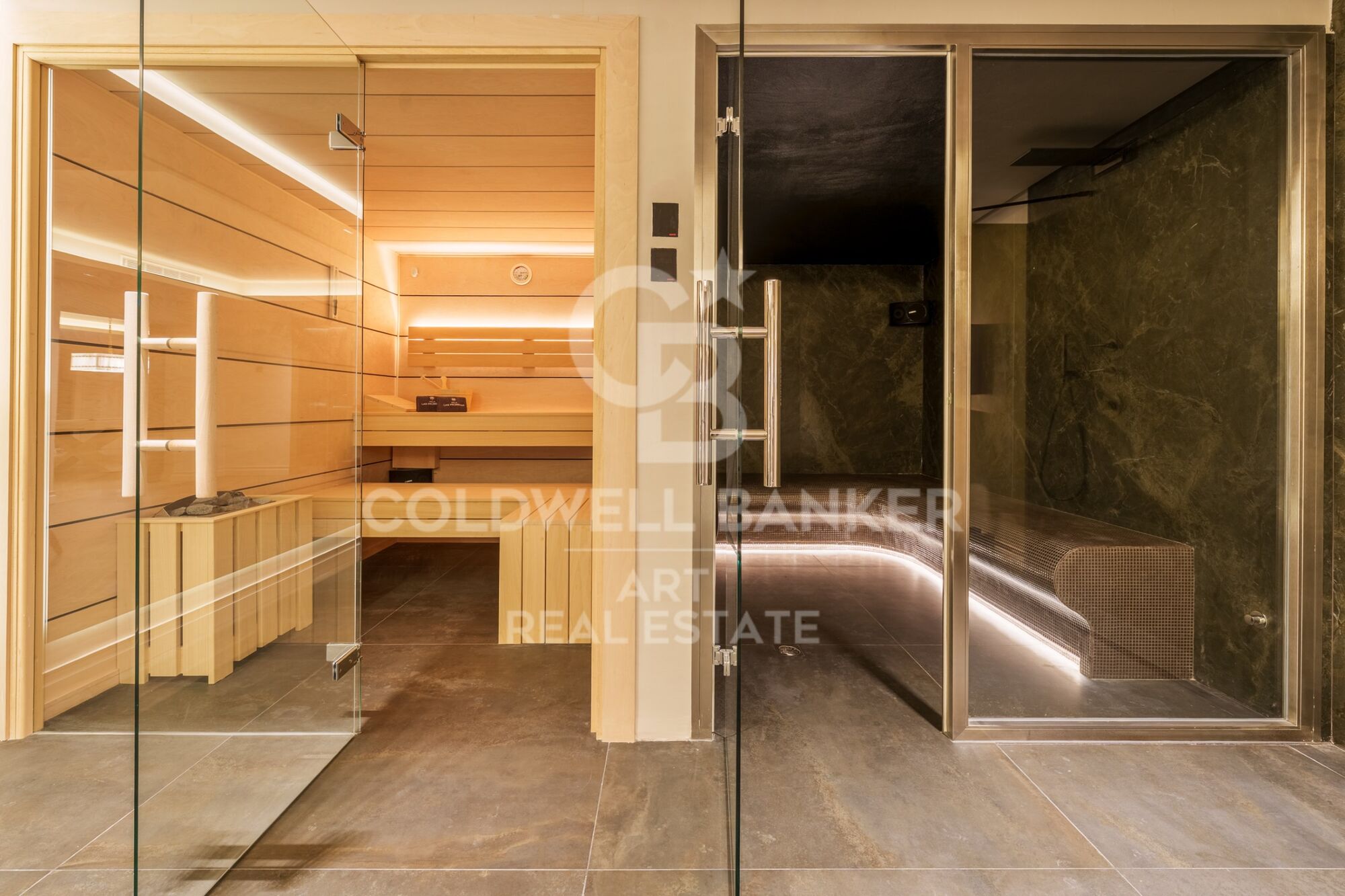 Distribuida en tres plantas, la vivienda cuenta con un impresionante nivel inferior de más de 300 m² con techos de 3 metros, ofreciendo infinitas posibilidades de entretenimiento y relajación. Incluye un garaje privado, una entrada con plataforma giratoria para vehículos y un lujoso spa con sauna y baño de vapor. Además, dispone de un gimnasio interior de última generación y un cine en casa, pensados para el disfrute de los residentes.