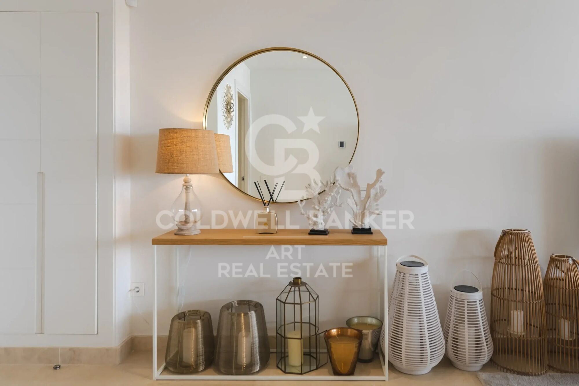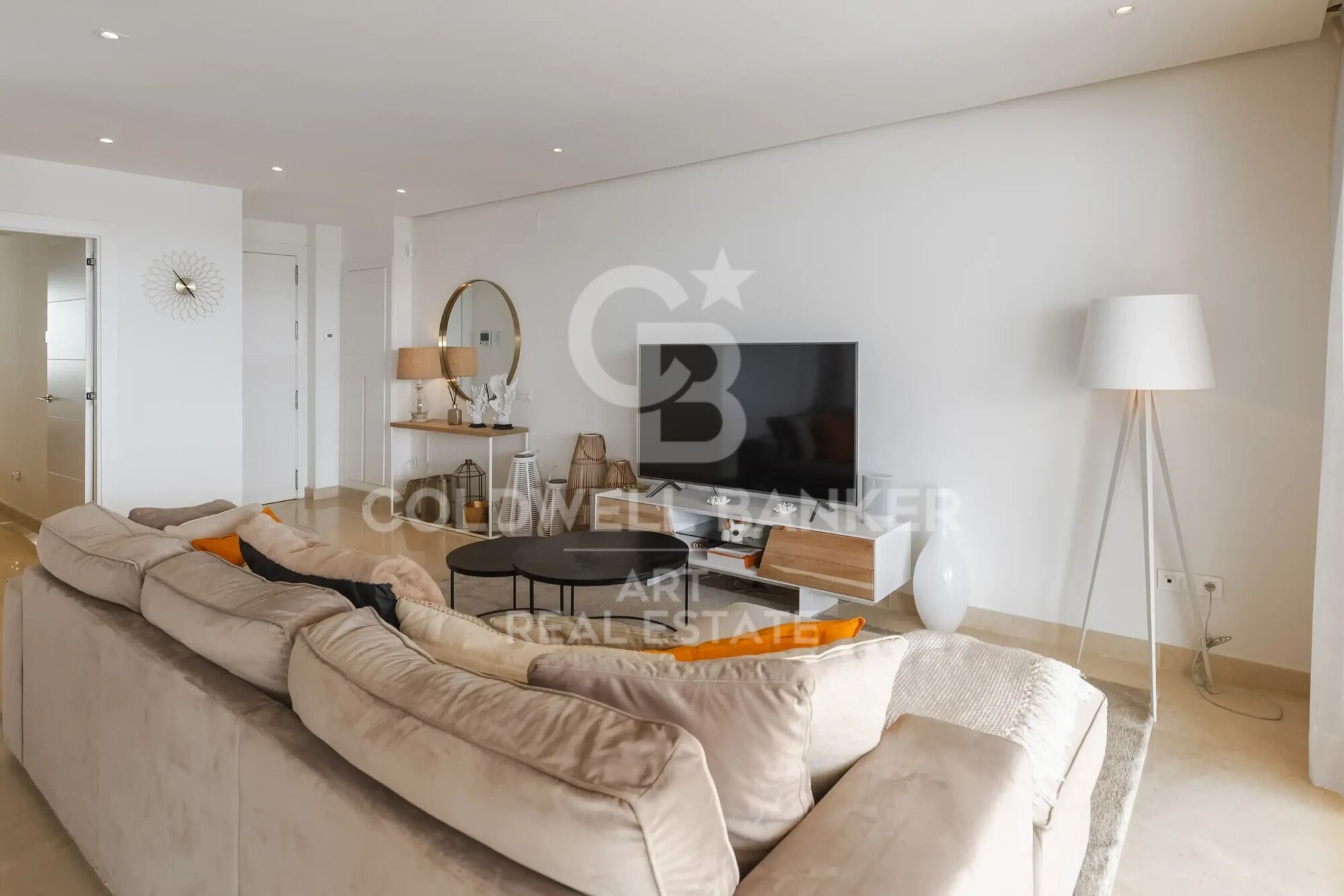 La terraza es, sin duda, uno de los grandes atractivos de esta vivienda. Cuidadosamente diseñada para disfrutar del clima mediterráneo durante todo el año, cuenta con una refinada zona de comedor al aire libre y un cómodo salón exterior, ideal tanto para relajarse como para socializar. Sus vistas al complejo y su orientación privilegiada aseguran sol durante todo el día, creando un escenario perfecto para vivir al aire libre. El acceso directo desde la terraza al salón y al dormitorio principal refuerza la sensación de continuidad entre interior y exterior, aportando amplitud y una conexión constante con la naturaleza.