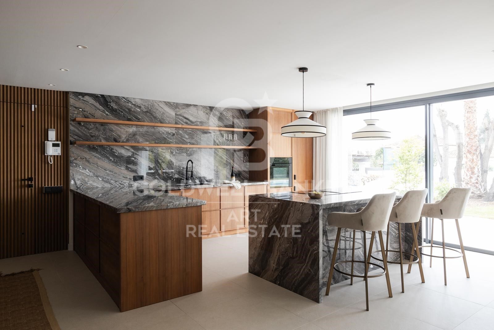 La cocina es un sueño para cualquier chef, con elegantes muebles en nogal, encimeras de mármol de lujo y electrodomésticos Miele de alta gama.