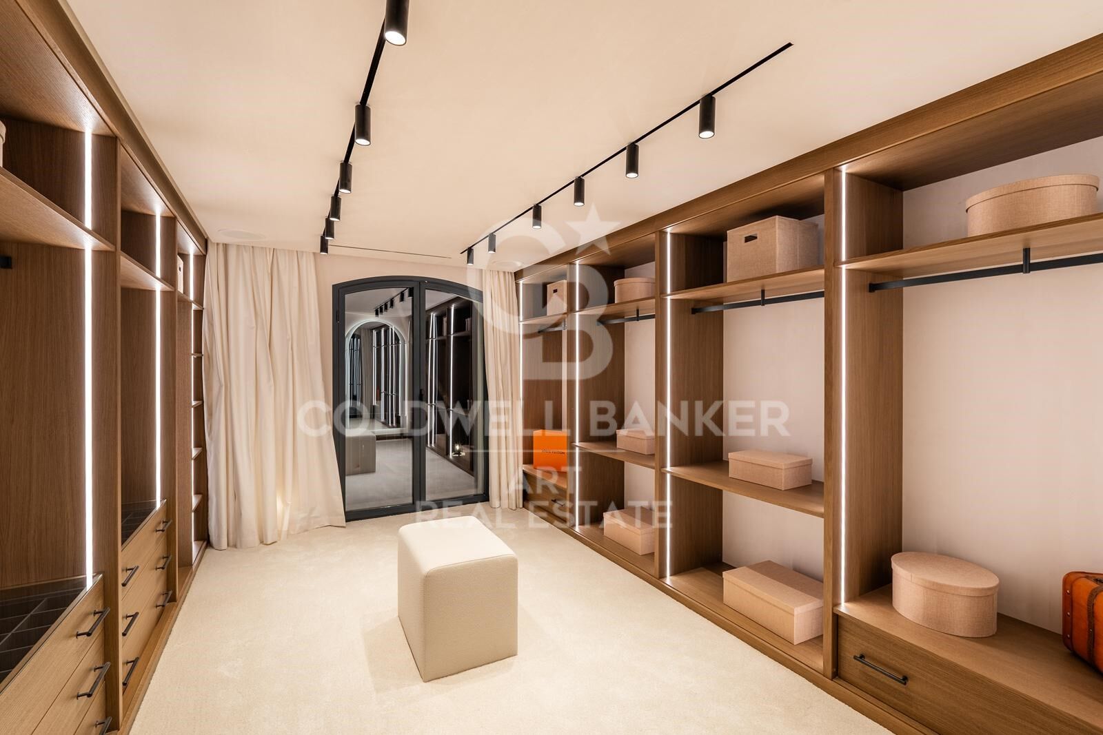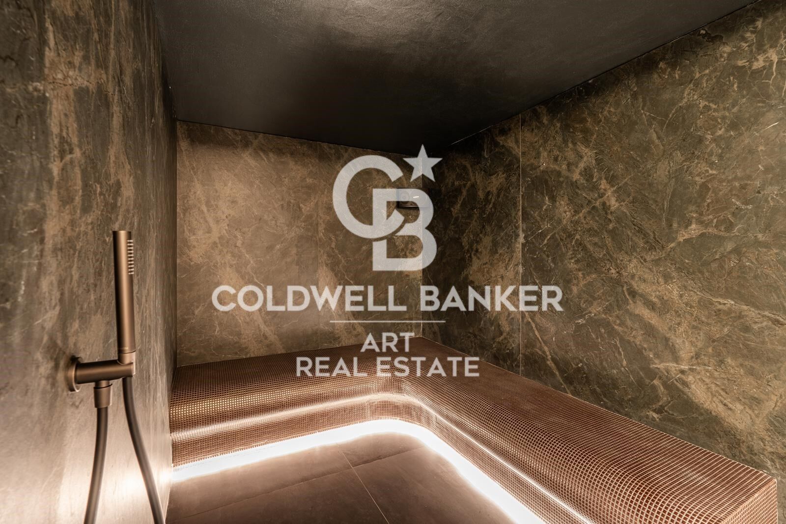 El sótano, con más de 250 m² y techos altos, está dedicado al bienestar y al entretenimiento. Dispone de una sala de cine privada, un spa con sauna y baño de vapor, un gimnasio totalmente equipado y un amplio garaje con plataforma giratoria para facilitar el estacionamiento. Desde aquí se accede directamente al jardín, creando una perfecta integración entre interior y exterior.