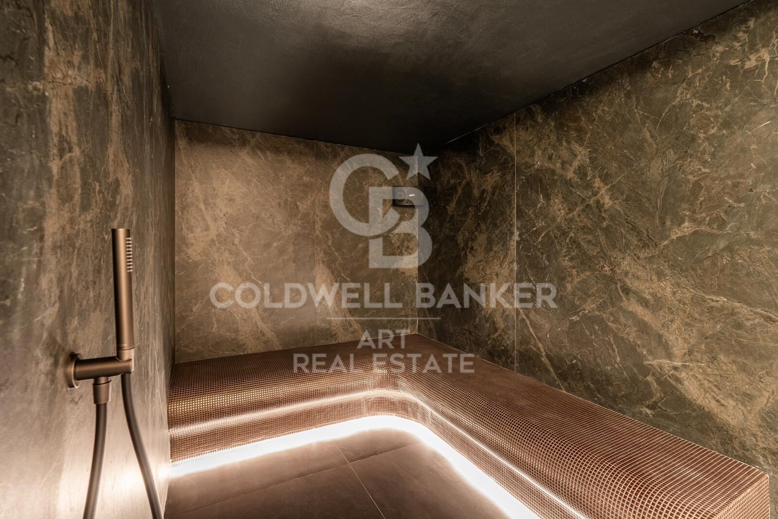 El sótano, con más de 250 m² y techos altos, está dedicado al bienestar y al entretenimiento. Dispone de una sala de cine privada, un spa con sauna y baño de vapor, un gimnasio totalmente equipado y un amplio garaje con plataforma giratoria para facilitar el estacionamiento. Desde aquí se accede directamente al jardín, creando una perfecta integración entre interior y exterior.