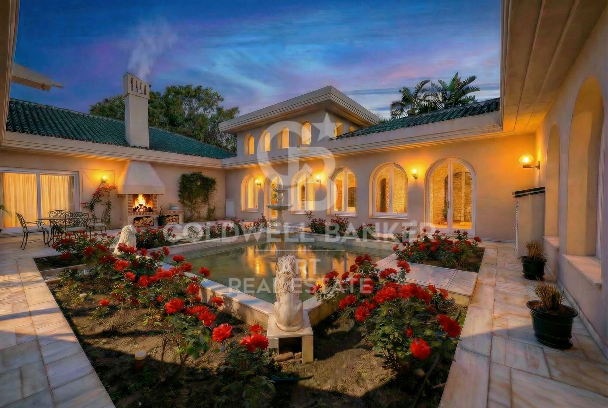 La finca actualmente cuenta con diez dormitorios y diez baños, distribuidos en un diseño clásico andaluz que incluye múltiples salones, amplias terrazas y un pabellón versátil apto para actividades de bienestar, entretenimiento o como bar privado. En el corazón de la residencia principal se encuentra un encantador patio central con fuente, rodeado de amplios salones y comedores, así como suites con acceso directo a las zonas exteriores. Una casa de invitados independiente de dos plantas ofrece alojamiento adicional, con más dormitorios, salones y su propia cocinaideal para visitantes o familiares. Los jardines están cuidadosamente diseñados, la piscina de gran tamaño enmarca las vistas panorámicas y el garaje tiene capacidad para cuatro coches.
