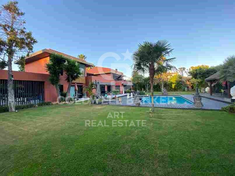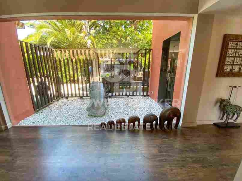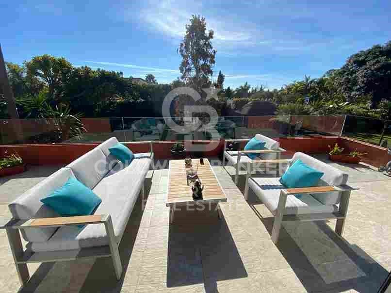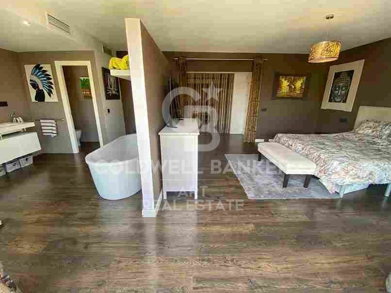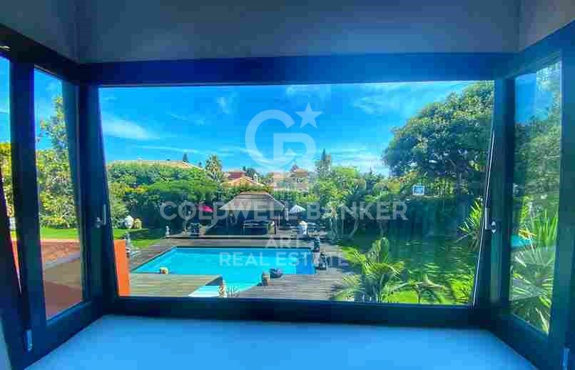 Desde el salón se accede a un encantador comedor acristalado, ideal para los días más frescos, así como al jardín, orientado de forma óptima para aprovechar al máximo la luz solar. El entorno tropical incluye una gran piscina con zona de jacuzzi y una elegante zona de barbacoa de estilo balinés, perfecta para disfrutar de agradables veladas al aire libre.