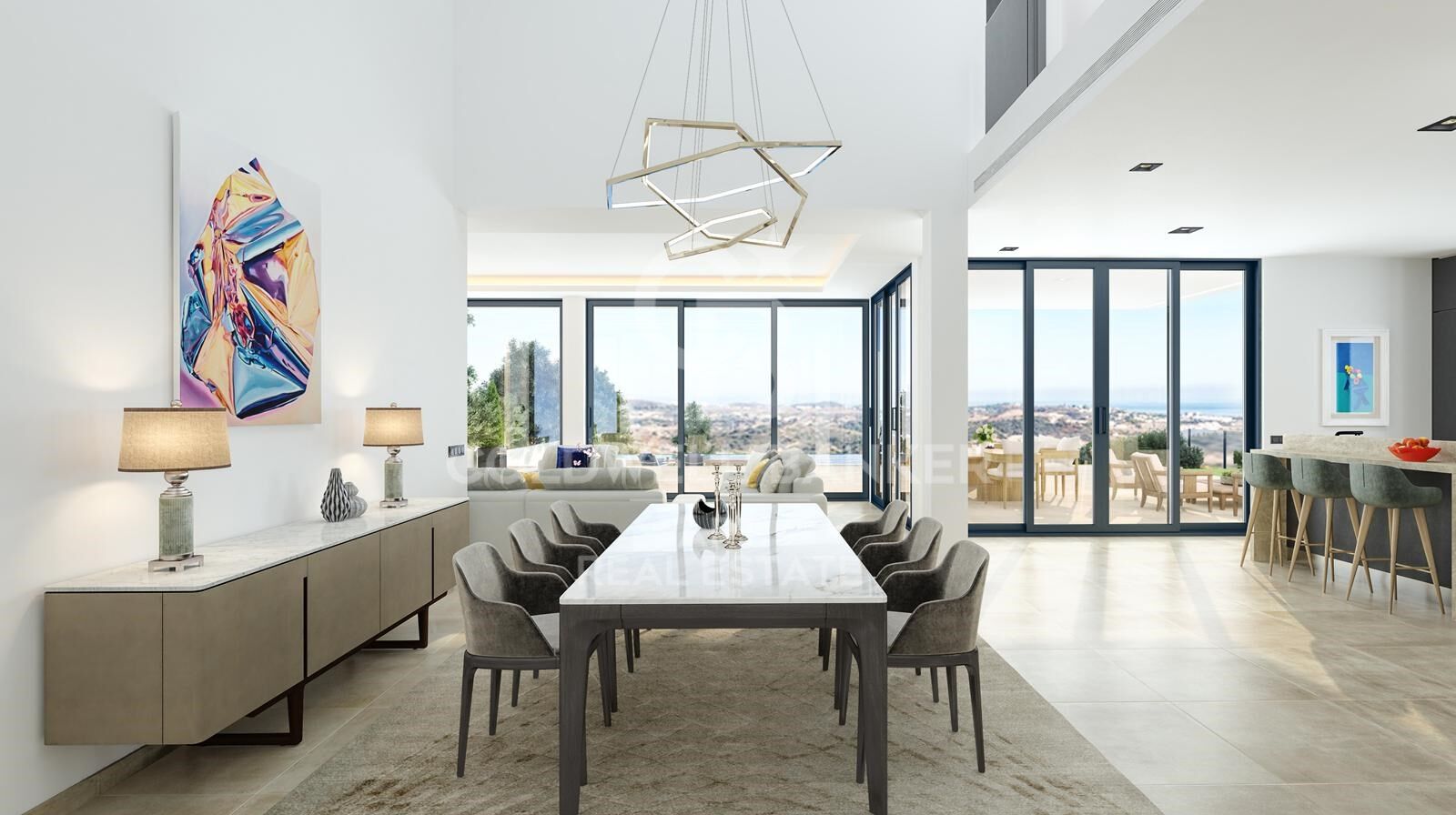La villa se distribuye en varias plantas. En la planta baja, encontramos un amplio salón-comedor con doble altura, lo que le aporta una gran luminosidad y amplitud. También hay un aseo de cortesía y un espacioso dormitorio en suite para invitados. La cocina abierta, completamente equipada, se conecta con un práctico cuarto de lavandería y tiene acceso directo a la terraza y el jardín, donde destaca la piscina infinity.