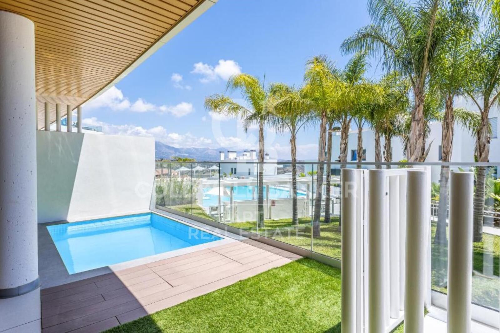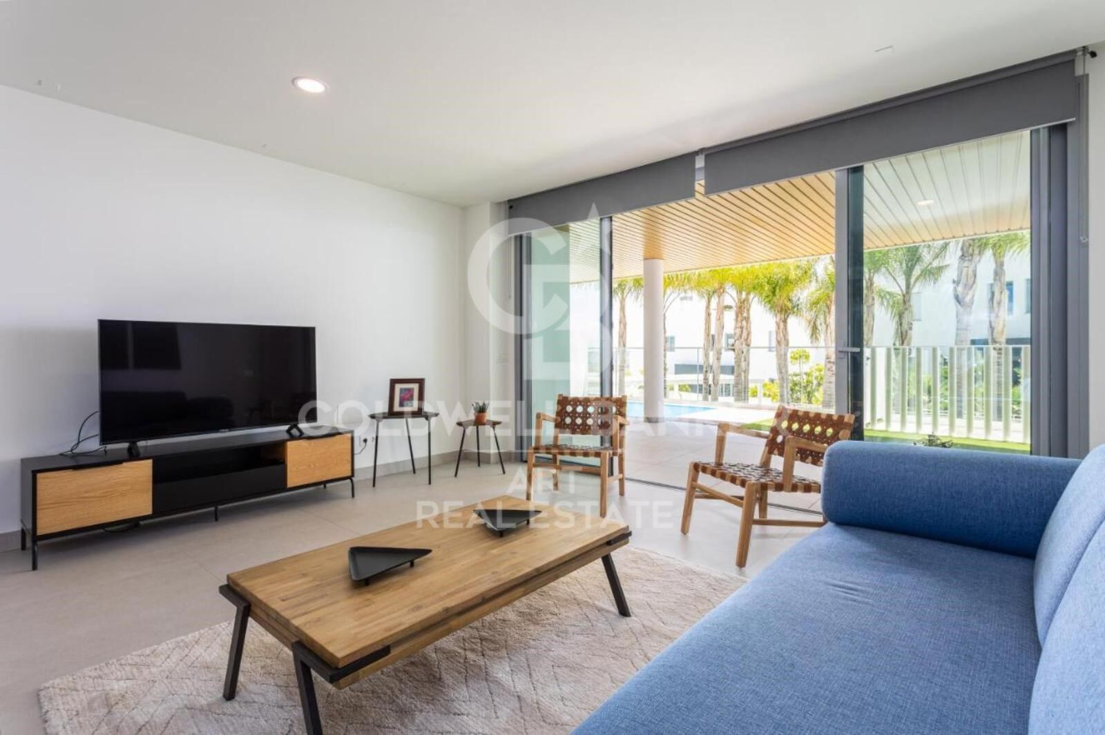 Coldwell Banker le ofrece esta oportunidad única de adquirir un espacioso apartamento en planta baja con jardín y piscina privados y con vistas panorámicas al campo de golf, al mar y a la montaña, y una prefecta orientación sur. Amplio salón con cocina abierta, totalmente equipada y acceso directo a una enorme terraza cubierta con impresionantes vistas al campo de golf de Calanova. Dos dormitorios, cada uno con su propio baño y acceso directo a la terraza y al jardín privado, un aseo de invitados y un lavadero independiente. Calefacción por suelo radiante en todo el apartamento, sistema de domótica, etc. Dos plazas de aparcamiento subterráneo y un trastero también están incluidos en el precio de venta.