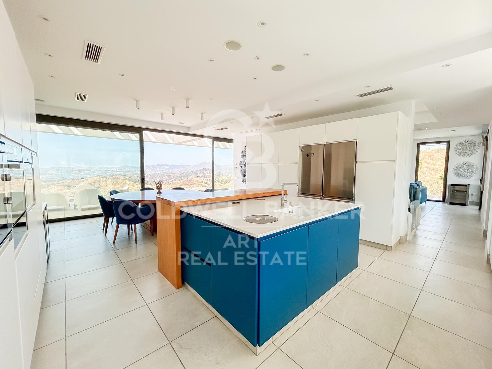 La planta alta está destinada a la vida social y al disfrute de las impresionantes vistas. Aquí se encuentra un amplio salón con techos altos, una moderna cocina abierta y un gran comedor que conecta con una espectacular terraza, desde donde se pueden contemplar los atardeceres más bellos sobre el valle y el mar. También dispone de un aseo de invitados y una escalera de acceso a la azotea, donde se ubican los paneles solares.