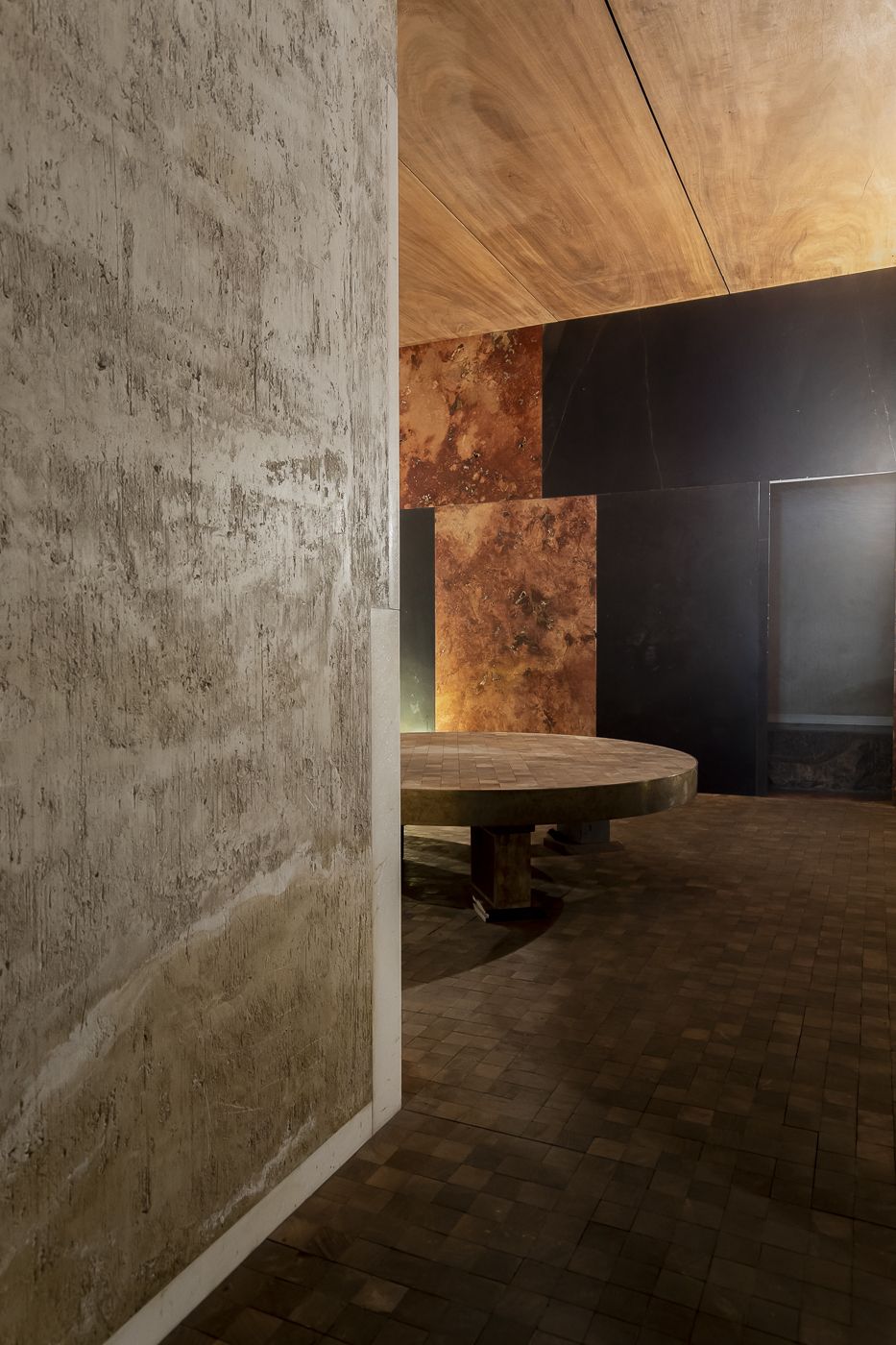 En realidad, la historia de este lugar es bastante singular. Inicialmente, surgió como un proyecto de una zapatería diseñado por el arquitecto Francisco Alonso por encargo del empresario del calzado Manuel Losada en 1987. A pesar de que el local nunca llegó a abrir sus puertas al público, quedó prácticamente terminado, y su singularidad se manifestó a través de composiciones abstractas en sus paredes, utilizando materiales como el mármol negro de Calatorao, el travertino rojo de Almería, el ónix verde de Irán y la madera de iroko. Una de las particularidades más notables es que las piezas no fueron unidas con cemento, sino que se ensamblaron unas sobre otras, casi como un rompecabezas.