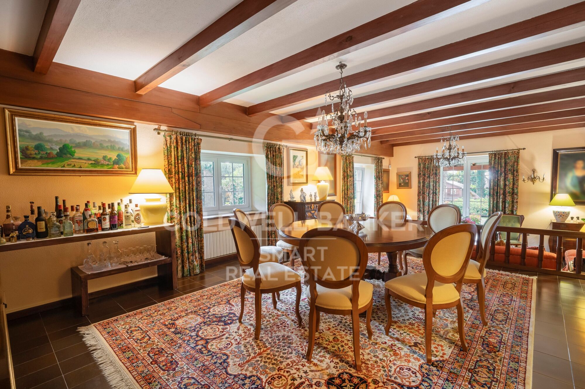 El terreno es sencillamente espectacular, un jardín cuidado con exquisito gusto, un bonito estanque, un cenador de madera, arboles, plantas y flores dispuestas por toda la finca que el paso del tiempo ha contribuido a dotar de una belleza difícil de igualar, la zona de piscina dispone de un gran porche con barbacoa, comedor de verano, una cocina completa, vestuarios y servicios,